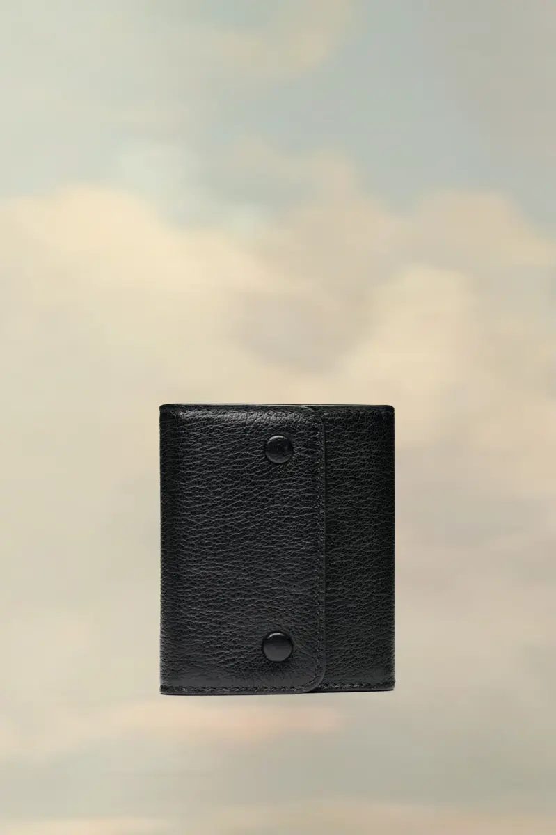 Realizzato in pelle granata, questo porta carte ha doppi bottoni automatici e la firma di Maison Margiela, le quattro cuciture bianche.