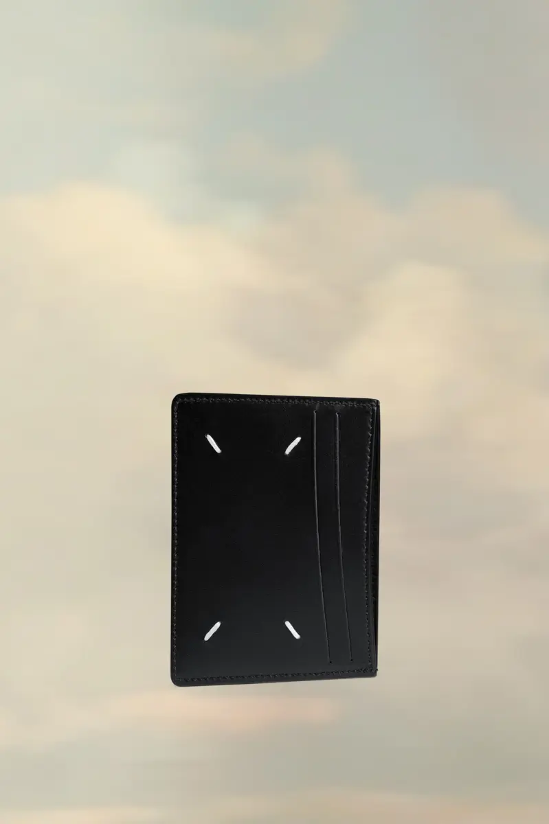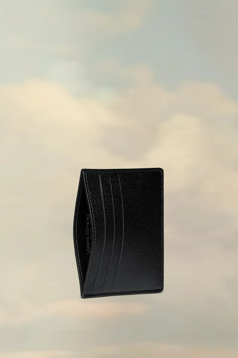Con cinque scomparti per carte e una tasca centrale, il porta carte è realizzato in pelle granata con il logo all’interno. La firma di Maison Margiela, le quattro cuciture, è presente sul retro, l’opposto di un’etichetta.