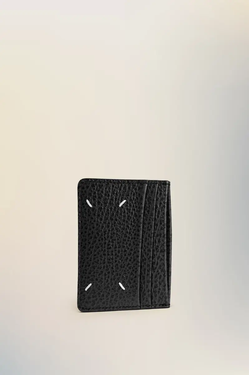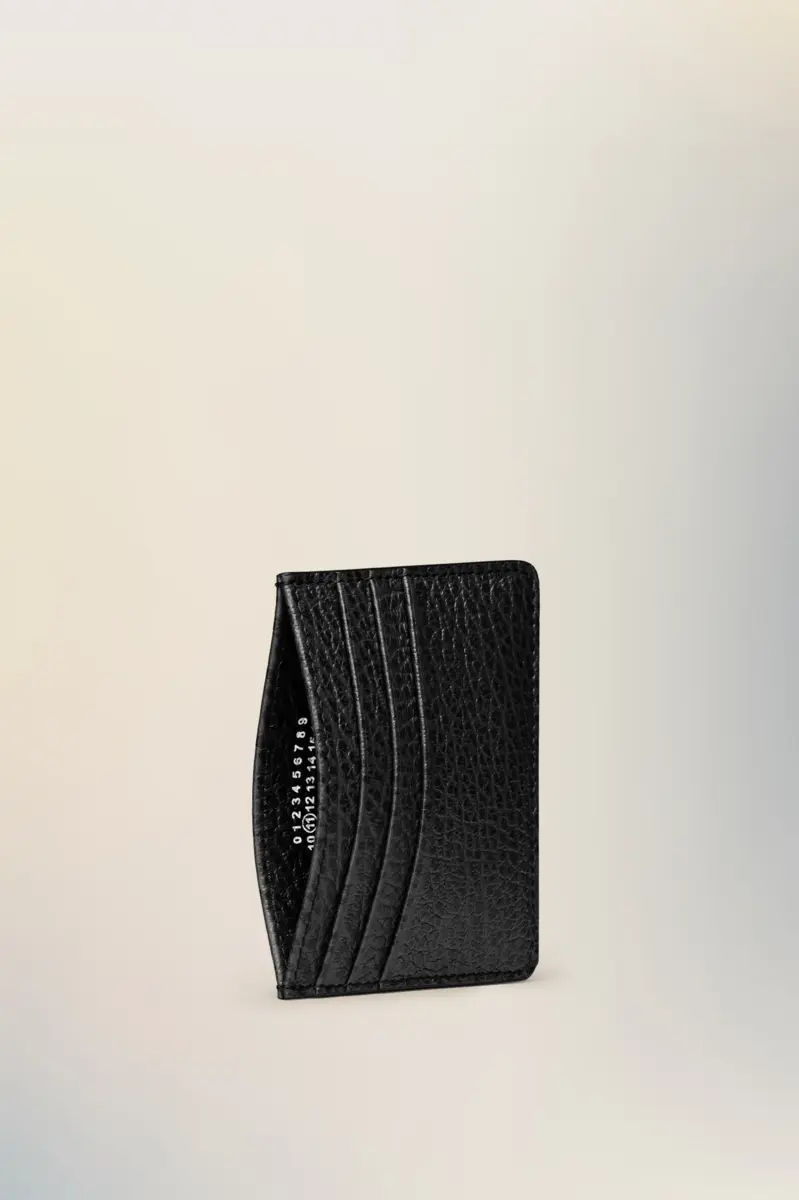 Il portacarte è realizzato in pelle goffrata a grana con cinque scomparti per carte e una sezione centrale con il logo numerico all’interno. La firma di Maison Margiela, le quattro cuciture, è presente sul retro, l’opposto di un’etichetta.