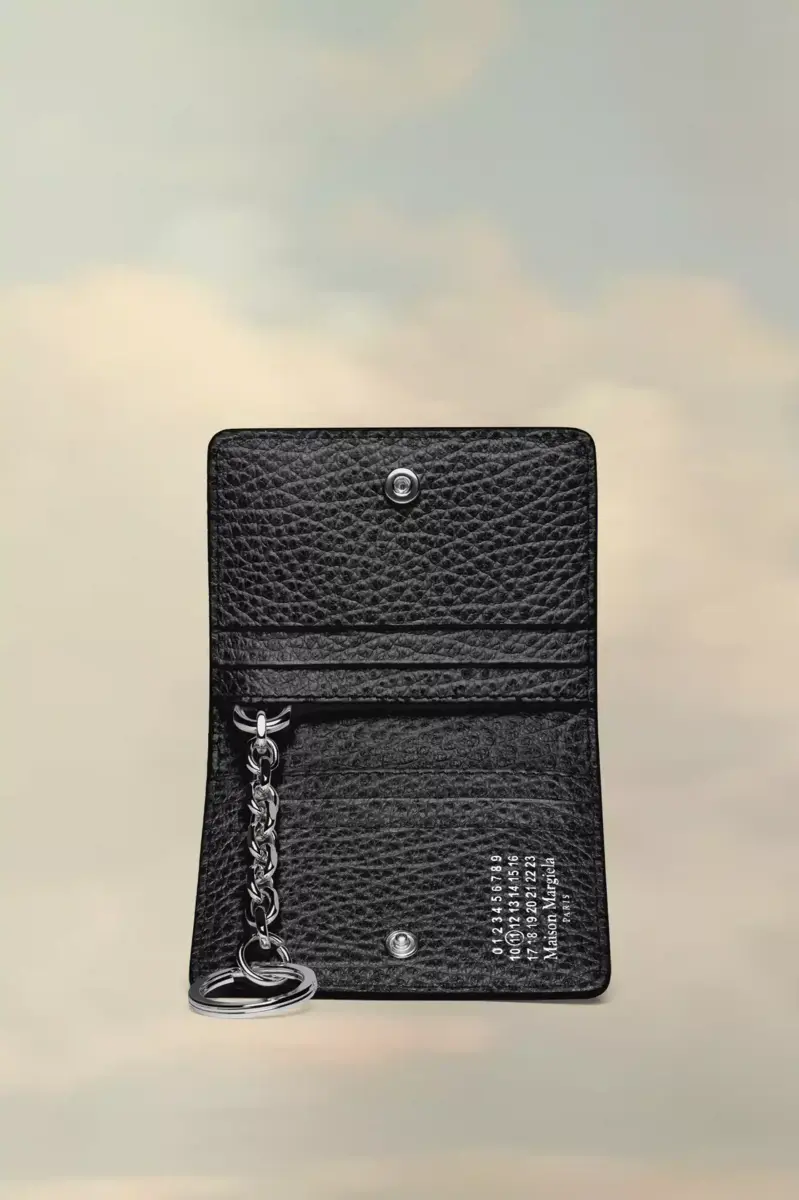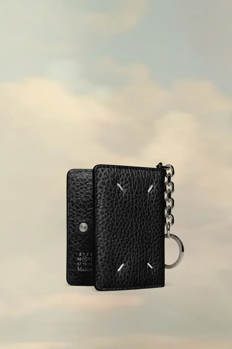 Realizzato in pelle goffrata a grana, il porta carte ha un portachiavi a catena, una chiusura con bottone automatico e diversi scomparti per carte. La firma di Maison Margiela, le quattro cuciture, è visibile sul retro, l’opposto di un’etichetta.