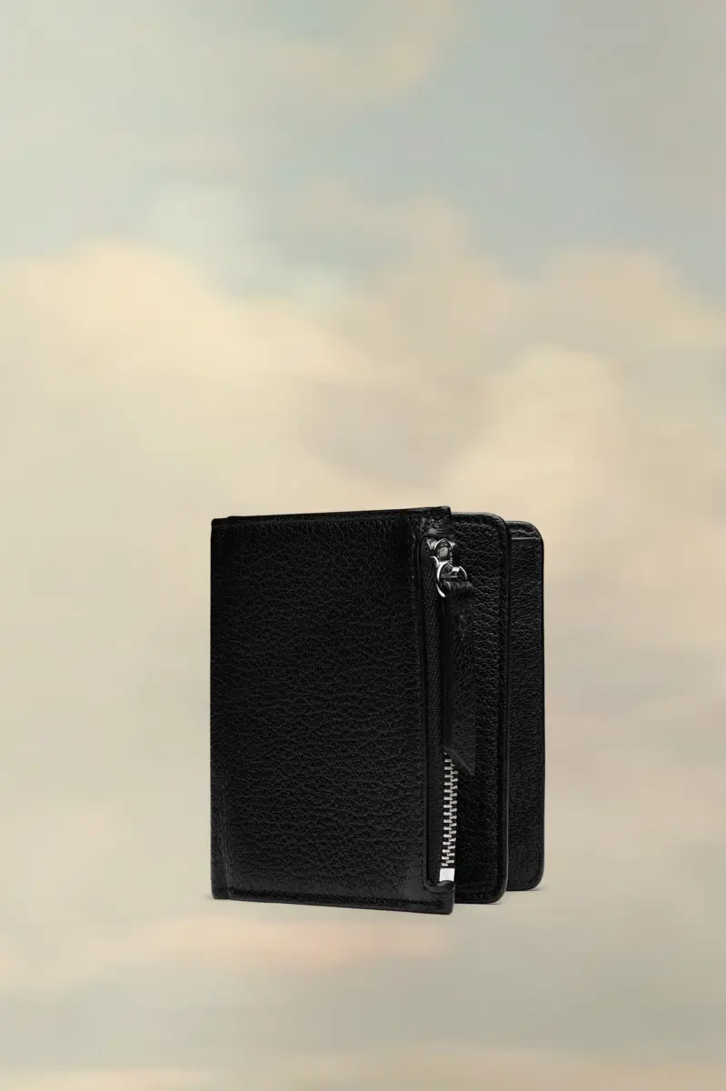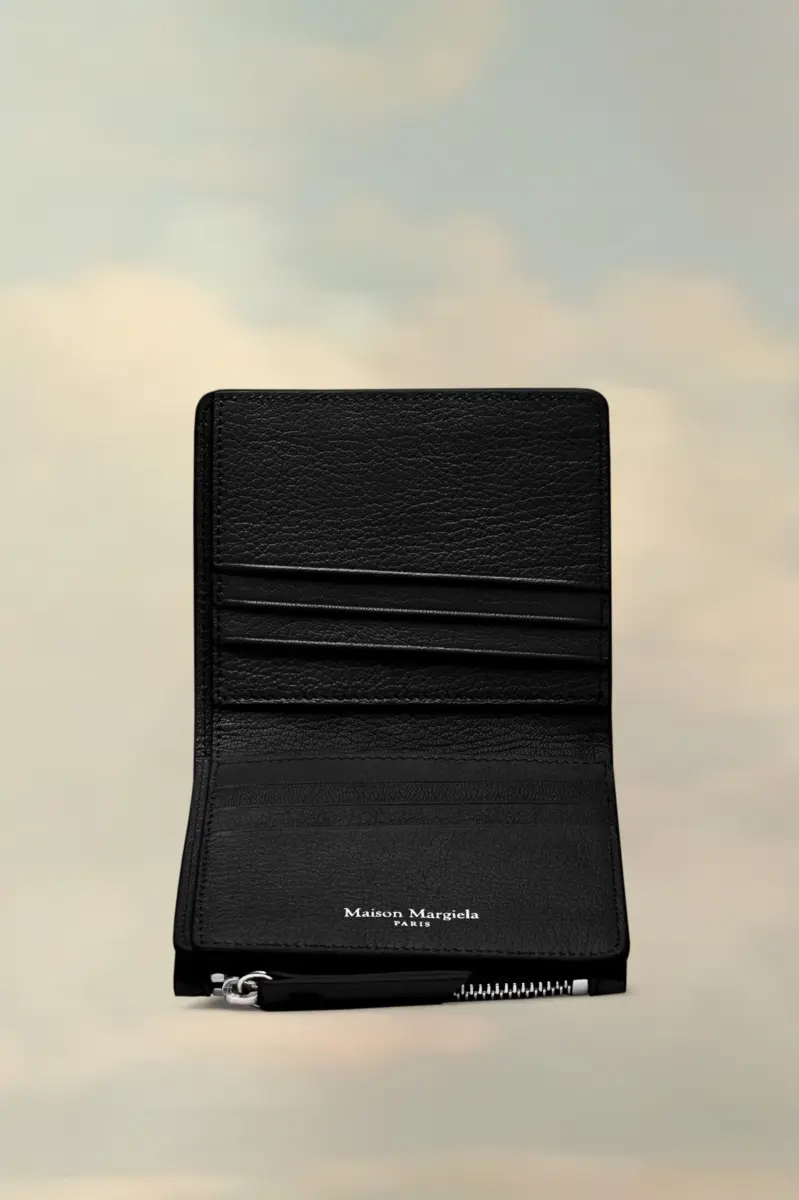 Il portafoglio è realizzato in pelle di capra e presenta otto scomparti per carte, una tasca con zip e il logo su tre sezioni. La firma di Maison Margiela, le quattro cuciture, è presente sul retro, l’opposto di un’etichetta.