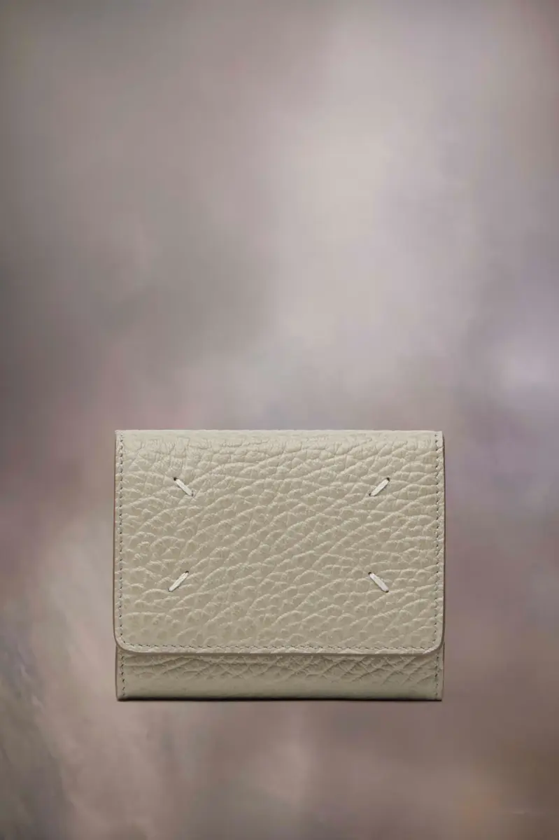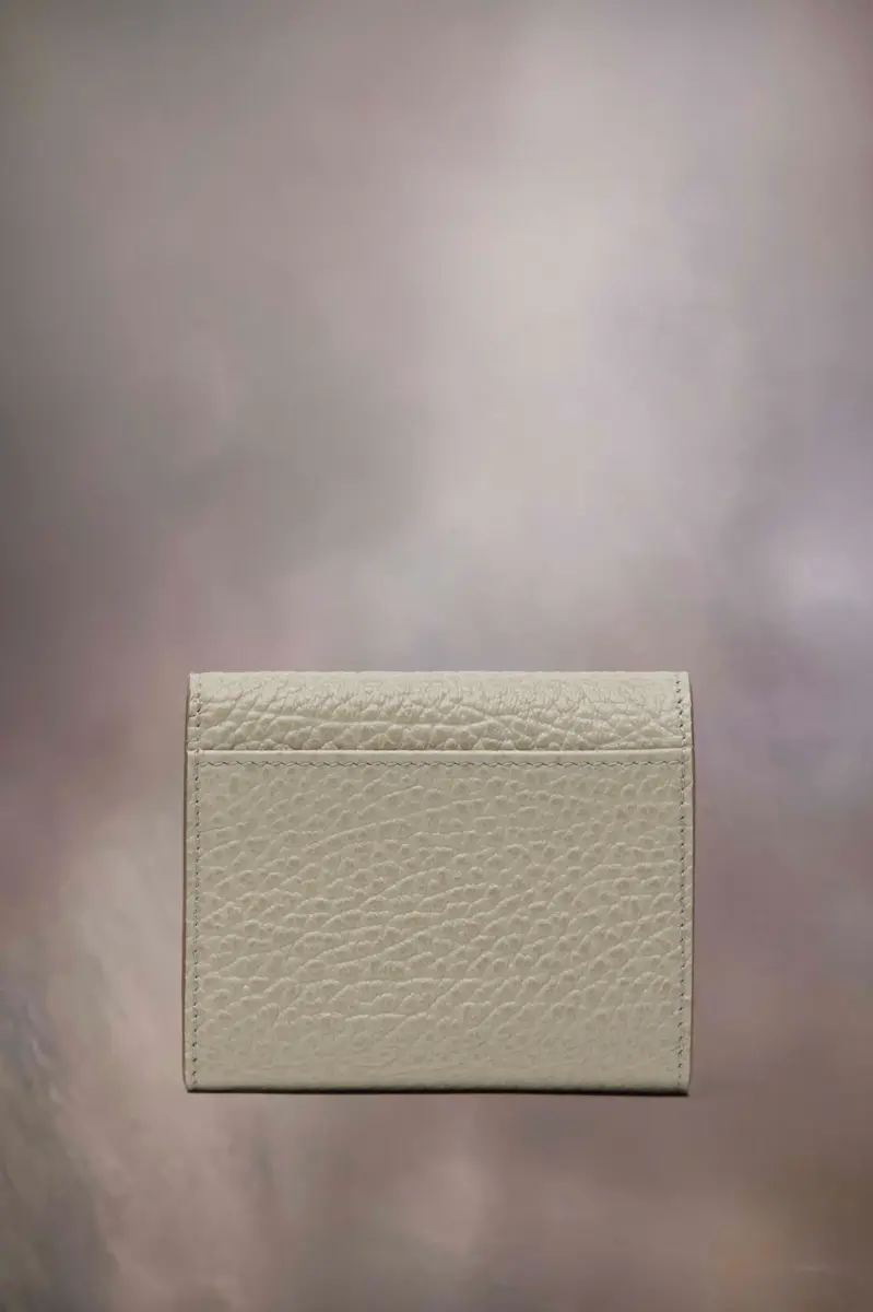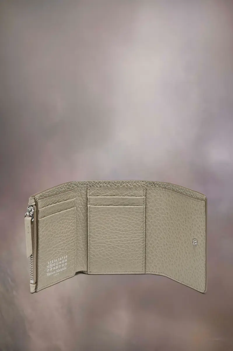 In pelle goffrata a grana, il portafoglio presenta il logo numerico all’interno, quattro scomparti per carte e una sezione con zip. La firma di Maison Margiela, le quattro cuciture, è visibile sul retro, l’opposto di un’etichetta.