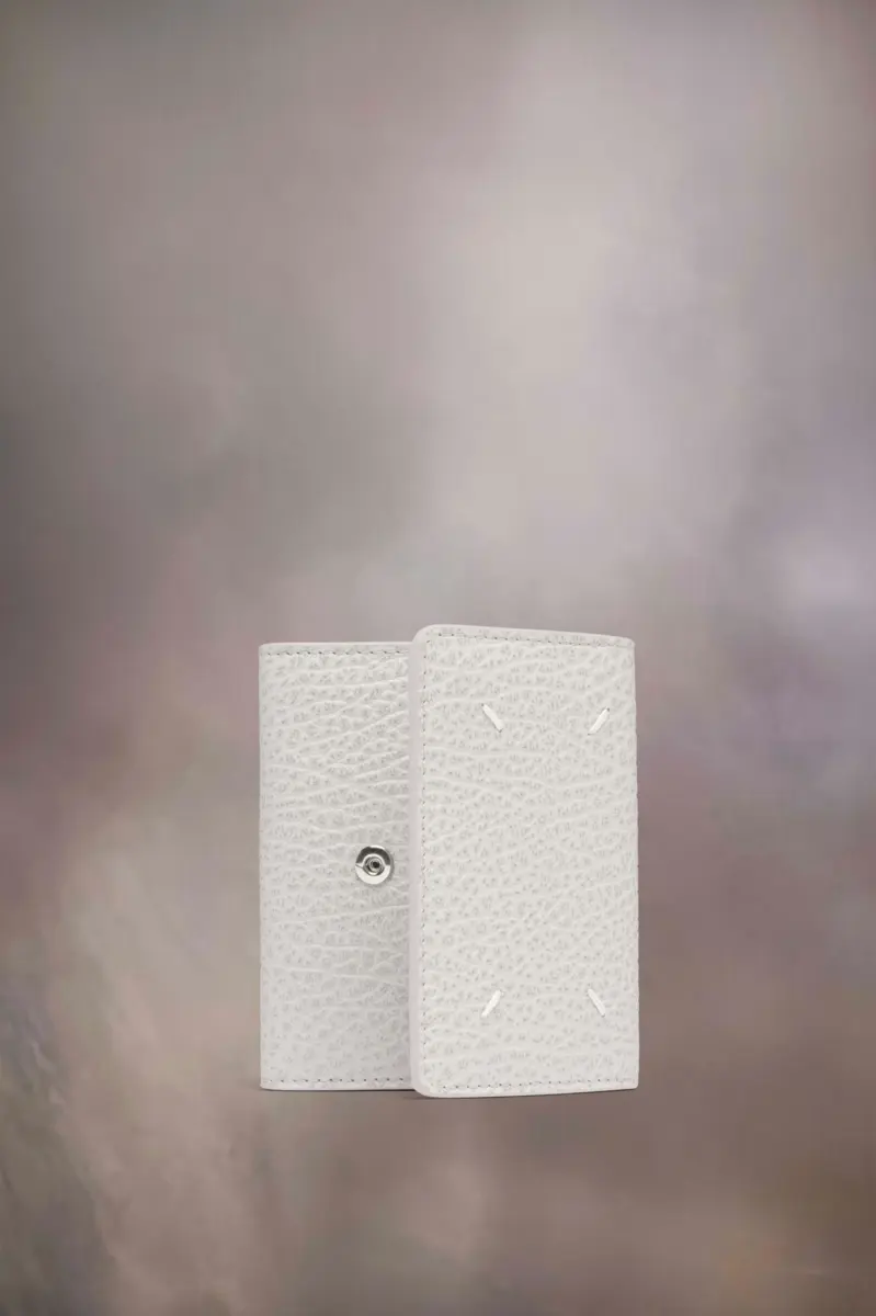 In pelle goffrata a grana, il portafoglio presenta il logo numerico all’interno, quattro scomparti per carte e una sezione con zip. La firma di Maison Margiela, le quattro cuciture, è visibile sul retro, l’opposto di un’etichetta.