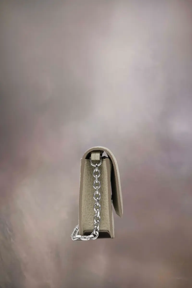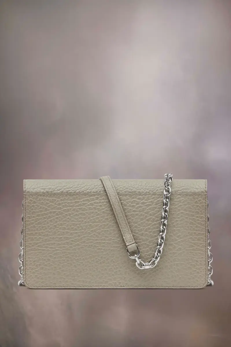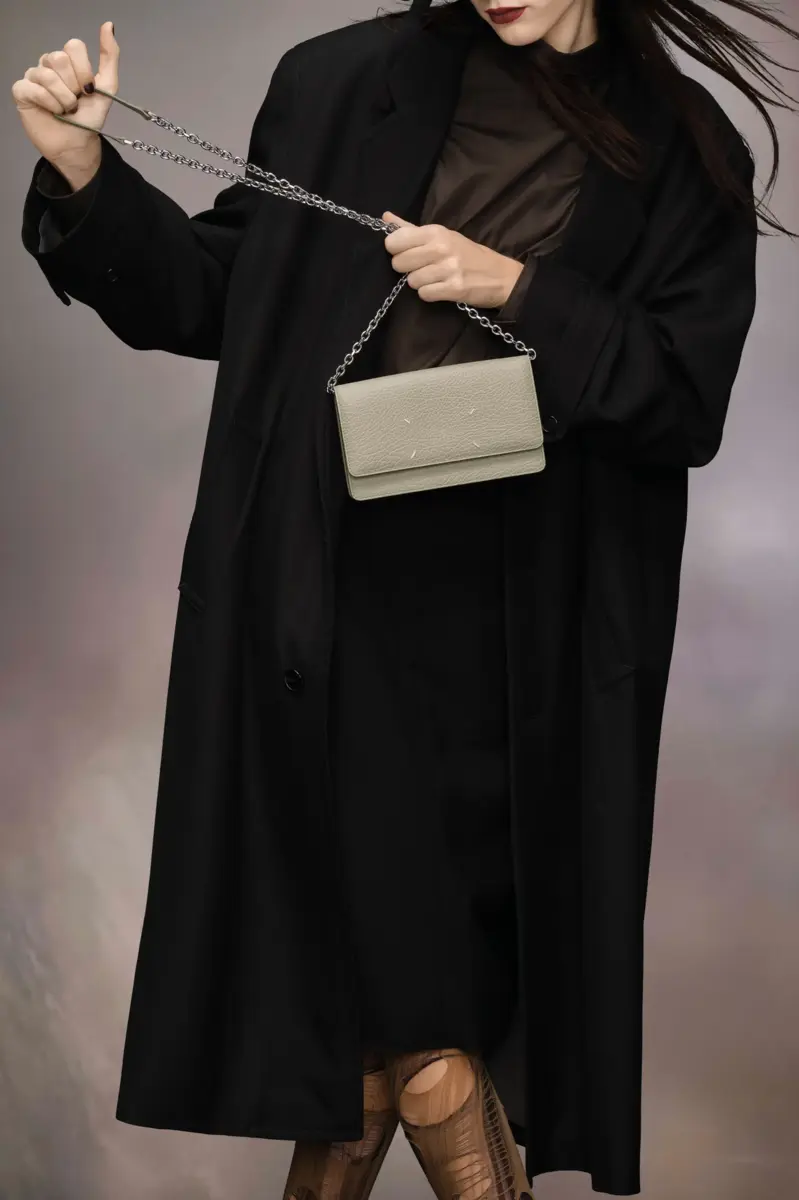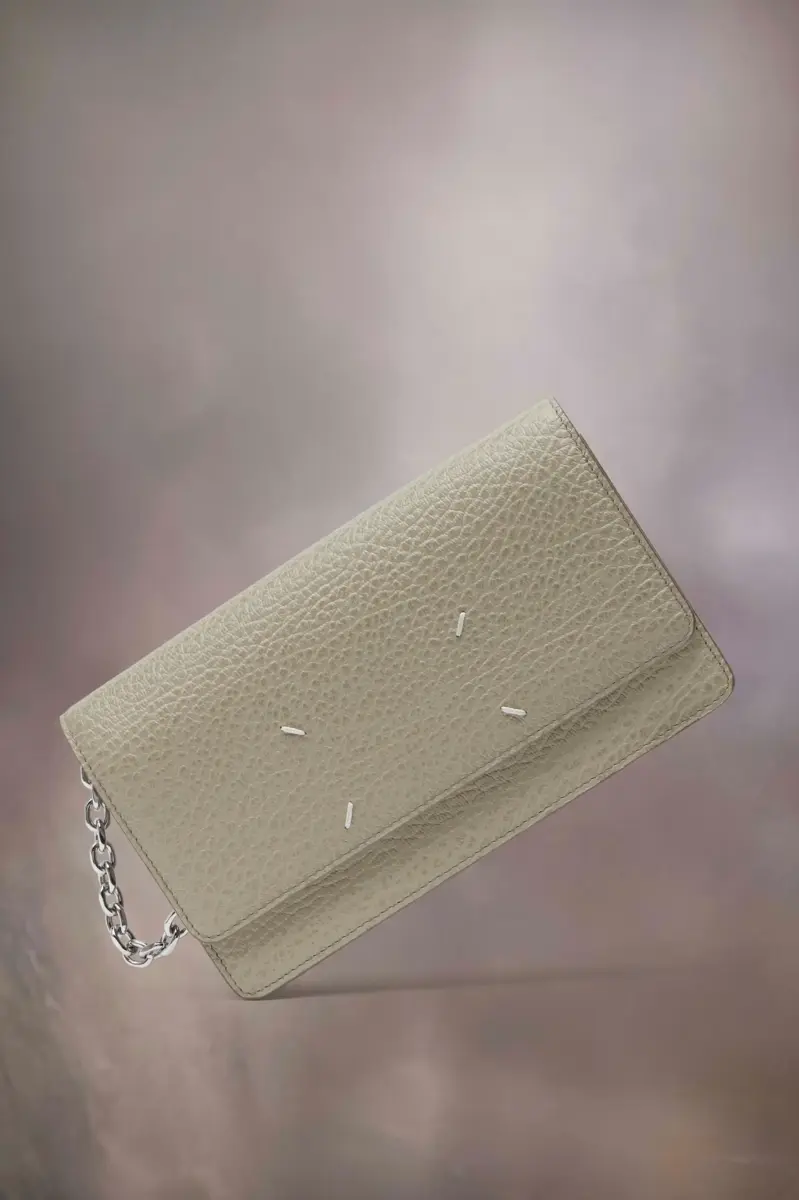 In pelle goffrata a grana con catena, il portafoglio ha una chiusura con bottone automatico e una sezione interna con zip. Presenta il logo numerico all’interno. La firma di Maison Margiela, le quattro cuciture, appare sulla patta, l’opposto di un’etichetta.
