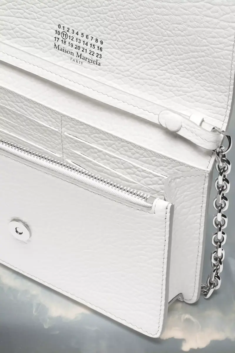 In pelle goffrata a grana con catena, il portafoglio ha una chiusura con bottone automatico e una sezione interna con zip. Presenta il logo numerico all’interno. La firma di Maison Margiela, le quattro cuciture, appare sulla patta, l’opposto di un’etichetta.