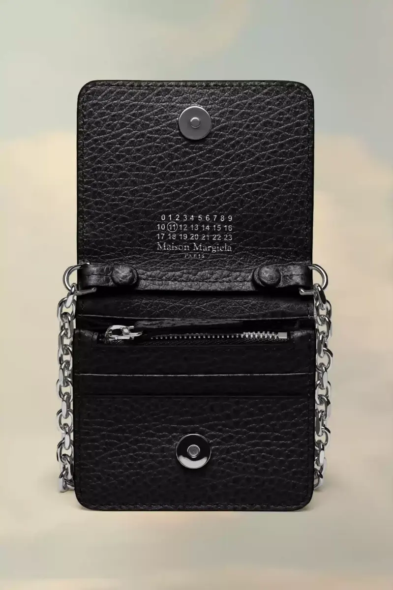 Questo portafoglio è realizzato in pelle goffrata con una lunga catena al collo. Si apre rivelando il logo numerico, un portamonete con cerniera e diversi portacarte. La firma di Maison Margiela, le quattro cuciture, è presente sul davanti; l’opposto di un’etichetta.