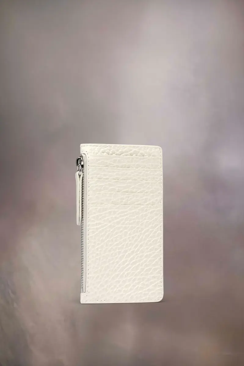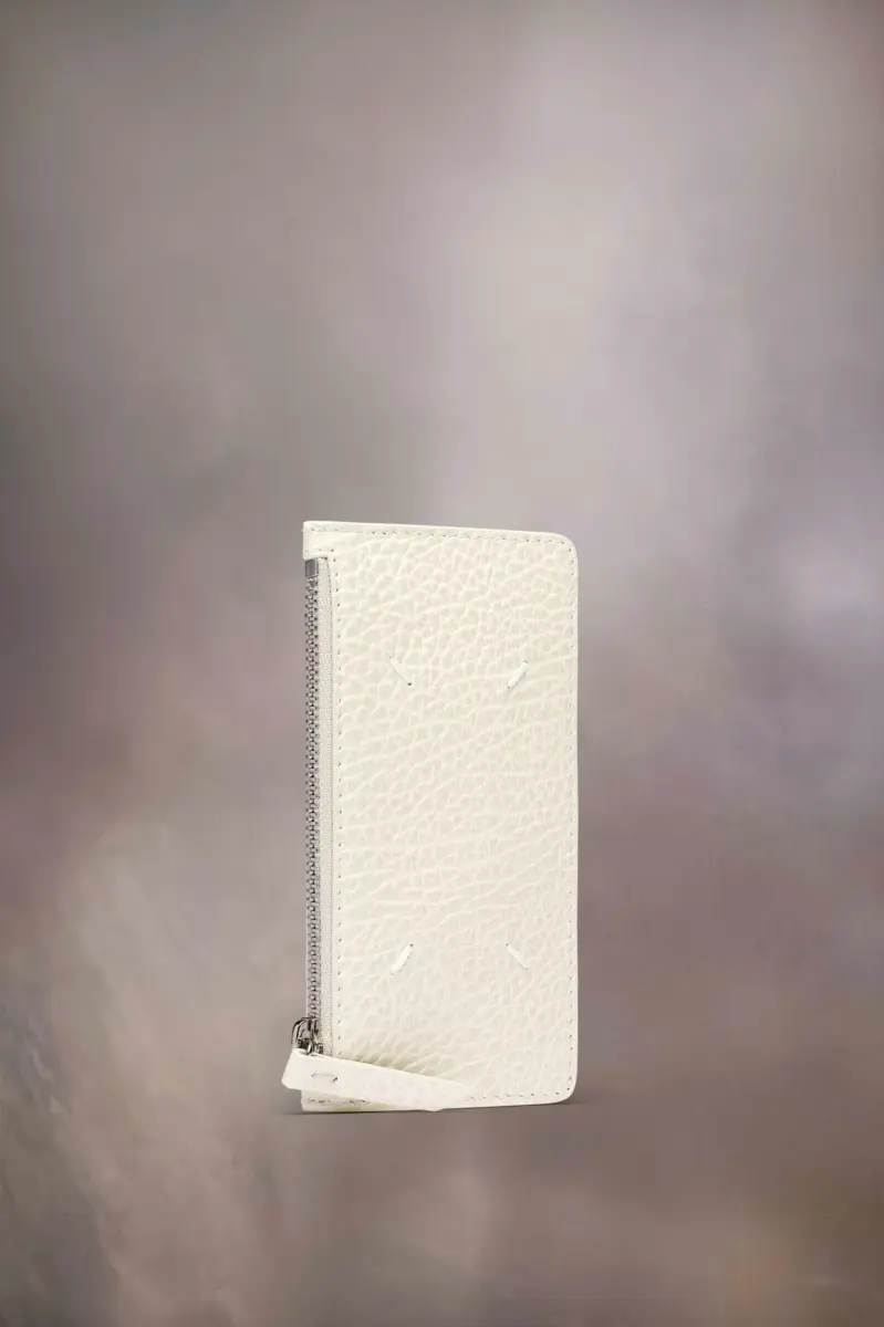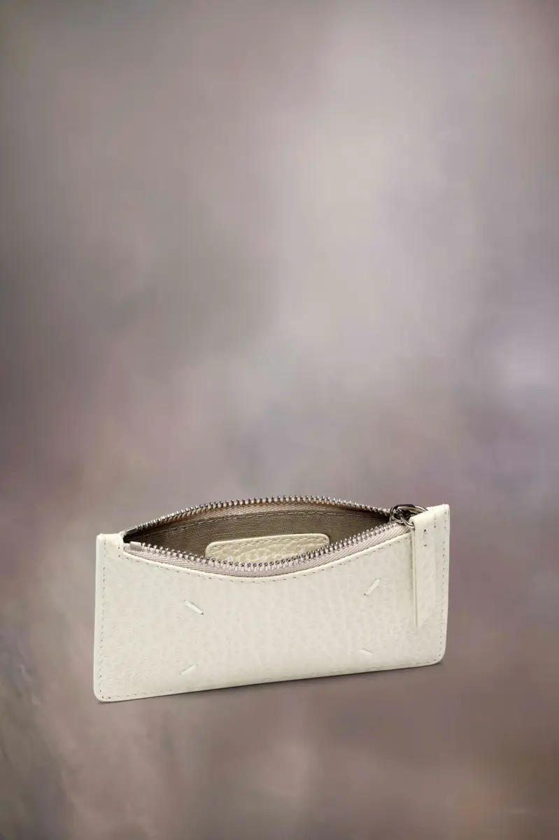 Realizzato in pelle goffrata a grana, il portafoglio porta carte ha una sezione con zip per monete e cinque scomparti per carte. Il logo numerico è presente all’interno. La firma di Maison Margiela, le quattro cuciture, è presente sul retro, l’opposto di un’etichetta.