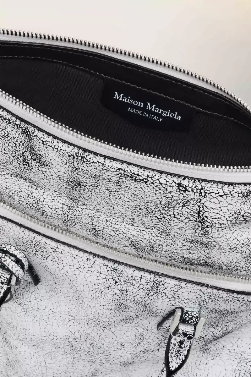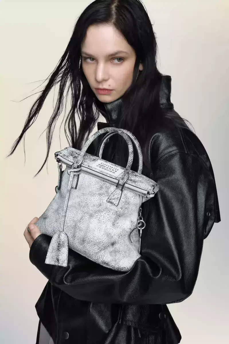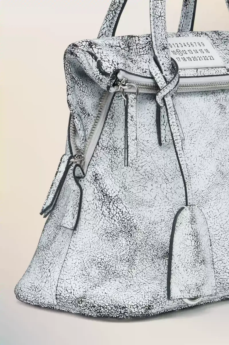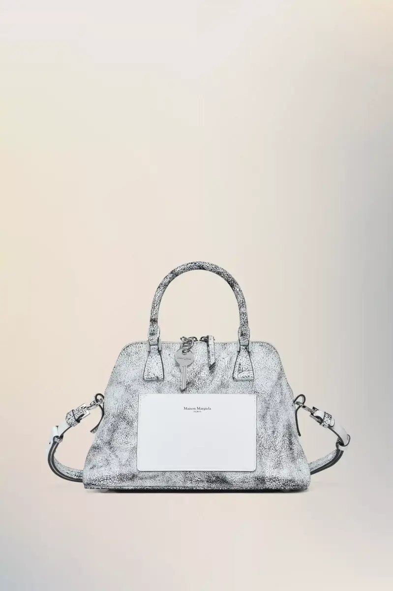 Una vernice bianca screpolata ricopre la superficie della mini 5AC Loved to Death, creando una finitura pensata per cambiare con l’usura. Applicata su pelle di vitello lavata e ammorbidita, la finitura semirigida rivela texture e irregolarità tonali nel tempo. L’iconica linea 5AC prende il nome dalla parola francese “sac” (borsa) ed esplora il concetto di “Anonimato della Fodera” della Maison. Rifinita con l’opera d’arte numerica della Maison.