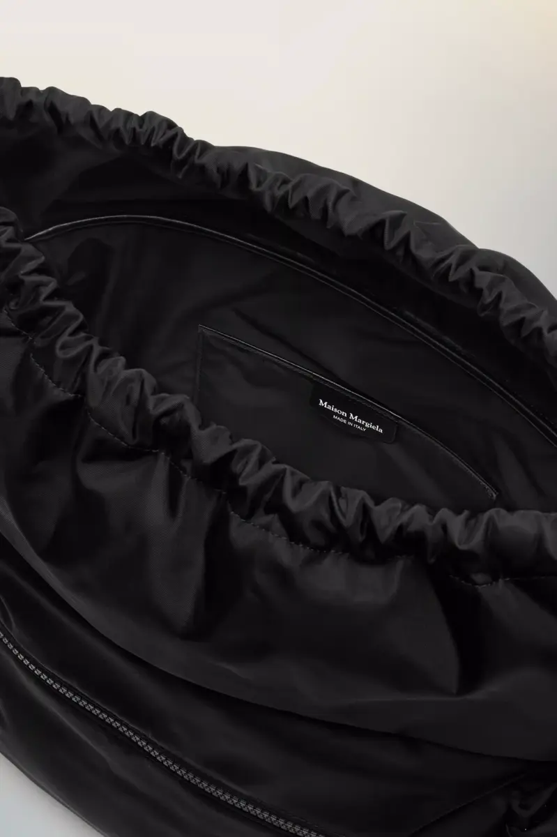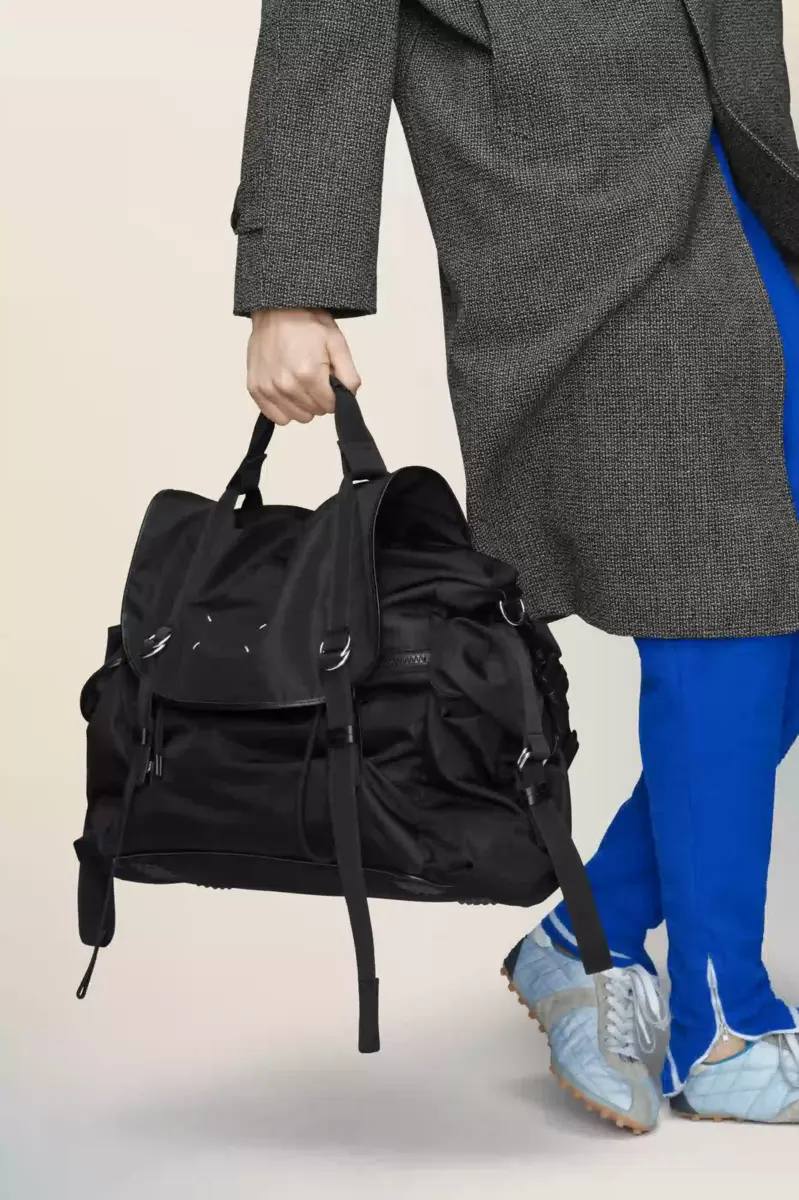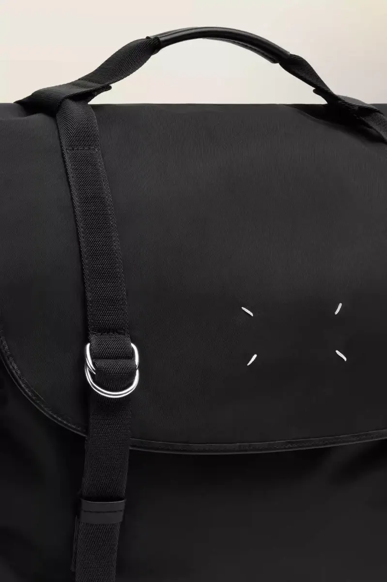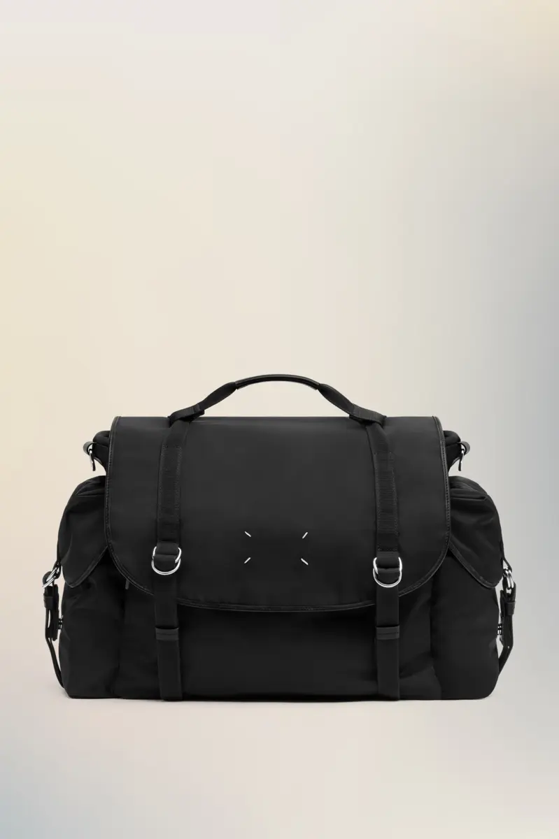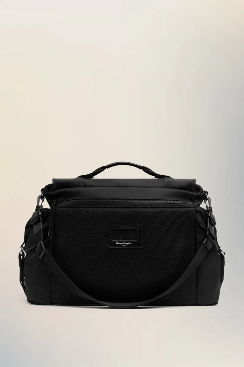 Maison Margiela reinterpreta la borsa messenger con una forma scolpita, una patta superiore con fibbia e due scomparti laterali. La sua struttura rigida contrasta con la rete traspirante e le tracolle morbide, pensate per una maggiore praticità. Una placca con logo tono su tono si trova sul retro, mentre le quattro cuciture appaiono sul davanti, l’opposto di un’etichetta.