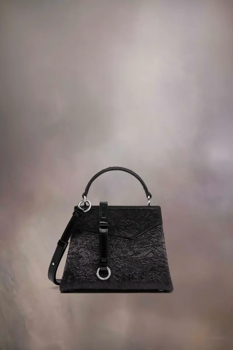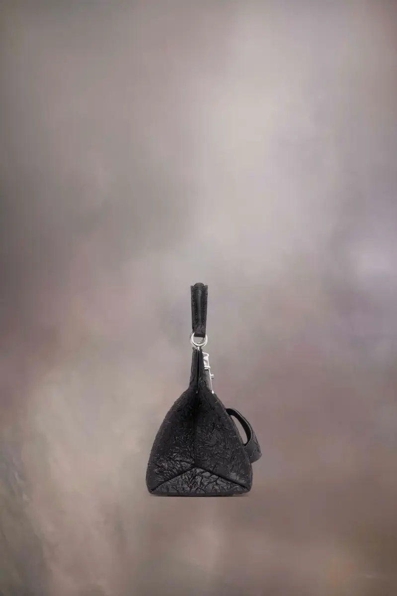 La borsa a mano Snatched piccola è realizzata in un tessuto testurizzato, con una finitura metallizzata e verniciata per enfatizzare le pieghe. La Snatched ha debuttato nella collezione Artisanal AI19. Prende il nome dal termine colloquiale che significa “bello”, e anche dal modo in cui può essere tenuta in mano come una presa. Questa borsa genderless presenta una forma asimmetrica, ispirata agli origami. Presenta una tracolla in pelle e un manico frontale traforato per essere indossata come una pochette. La borsa presenta la chiusura a lucchetto rettangolare specchiata della Maison, decorata con il logo numerico che si sblocca sul numero 11.