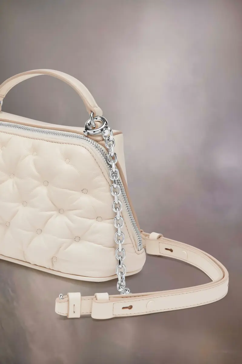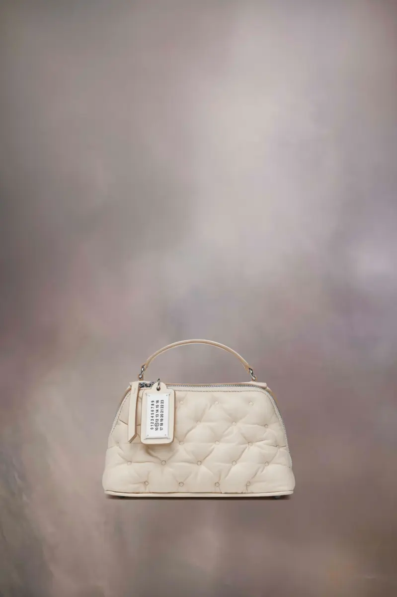La borsa trapezoidale Glam Slam è realizzata in nappa ricamata. Presentata per la prima volta nella sfilata PE18, la Glam Slam presenta un design trapuntato che richiama il matelassé, lo stile delle trapunte cucite a mano create a Marsiglia, in Francia. Il concept riflette la nozione di glamour inconscio della Maison ed evoca la sua associazione con il comfort, seguendo lo studio dei rituali di abbigliamento e viaggio in tutto il mondo. Questo modello presenta un manico superiore, una tracolla a catena staccabile ed è decorato con l’etichetta con logo numerico sul tiralampo.