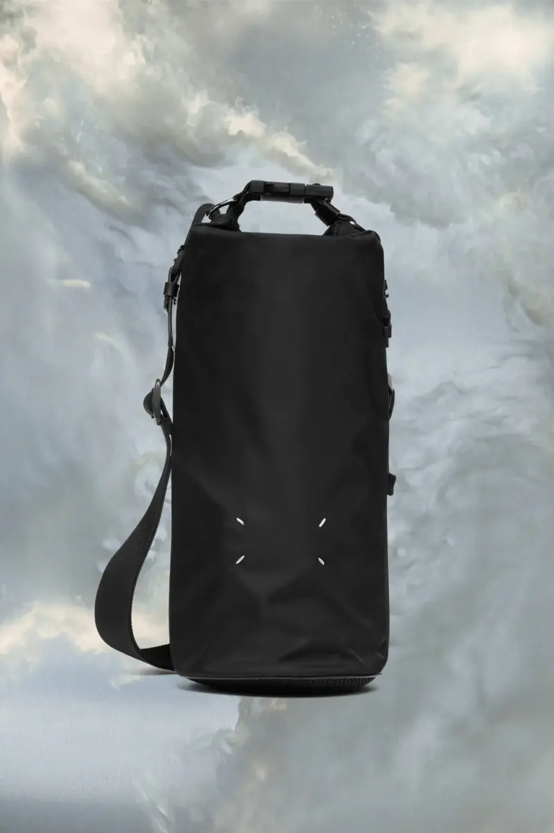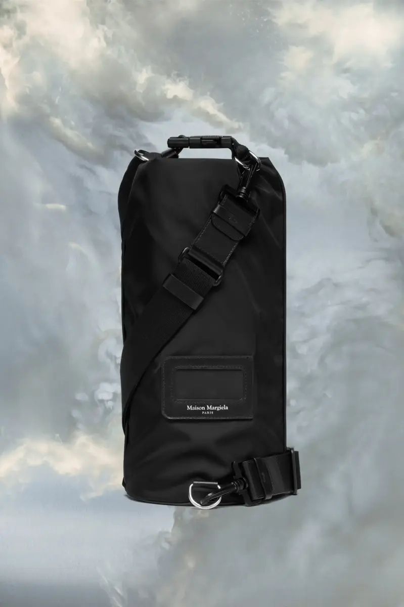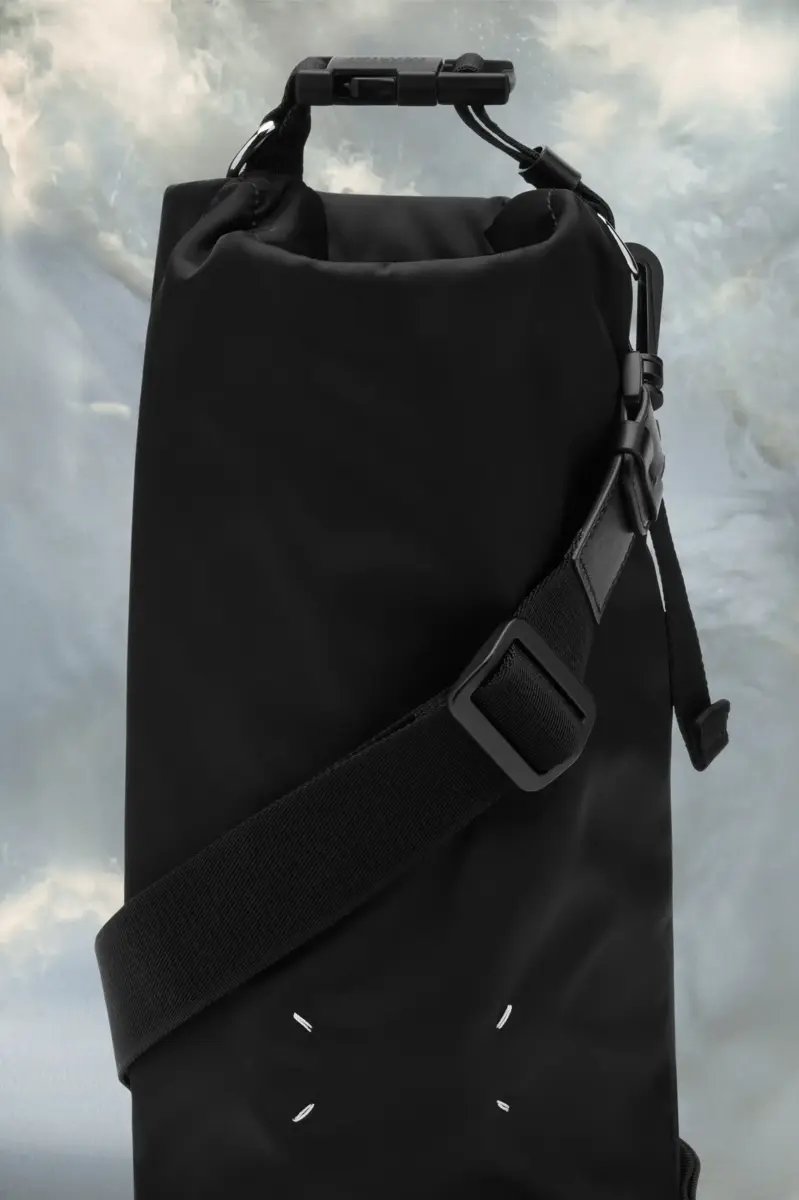 Ispirata all’abbigliamento outdoor, la borsa arrotolabile è realizzata in nylon con tracolla regolabile e staccabile e fibbia, impreziosita dal logo numerico Maison Margiela. Sul davanti è presente una fessura trasparente con il logo. Sul retro è presente la firma di Maison Margiela, i Quattro Punti. l’opposto di un’etichetta.