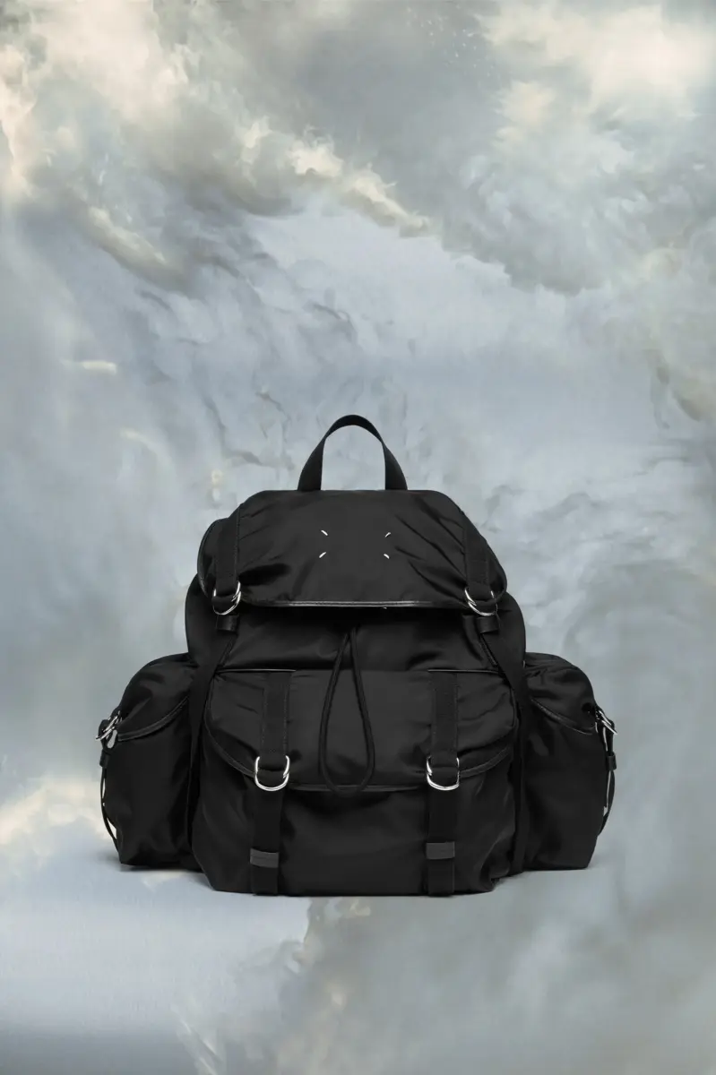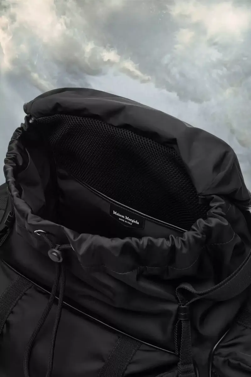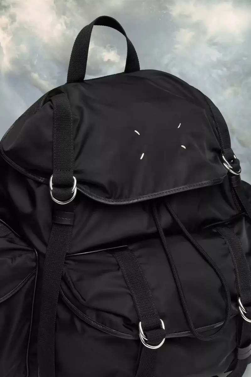 Lo zaino XL è un modello funzionale realizzato in nylon con contrasto in pelle di vitello. È dotato di coulisse, manico superiore e spallacci anatomici in rete ed è progettato con ampie tasche, chiuse da anelli a D e lacci pendenti. Sul retro è presente una fessura trasparente con il logo. La firma di Maison Margiela, i Quattro Punti, è presente sulla patta; l’opposto di un’etichetta.