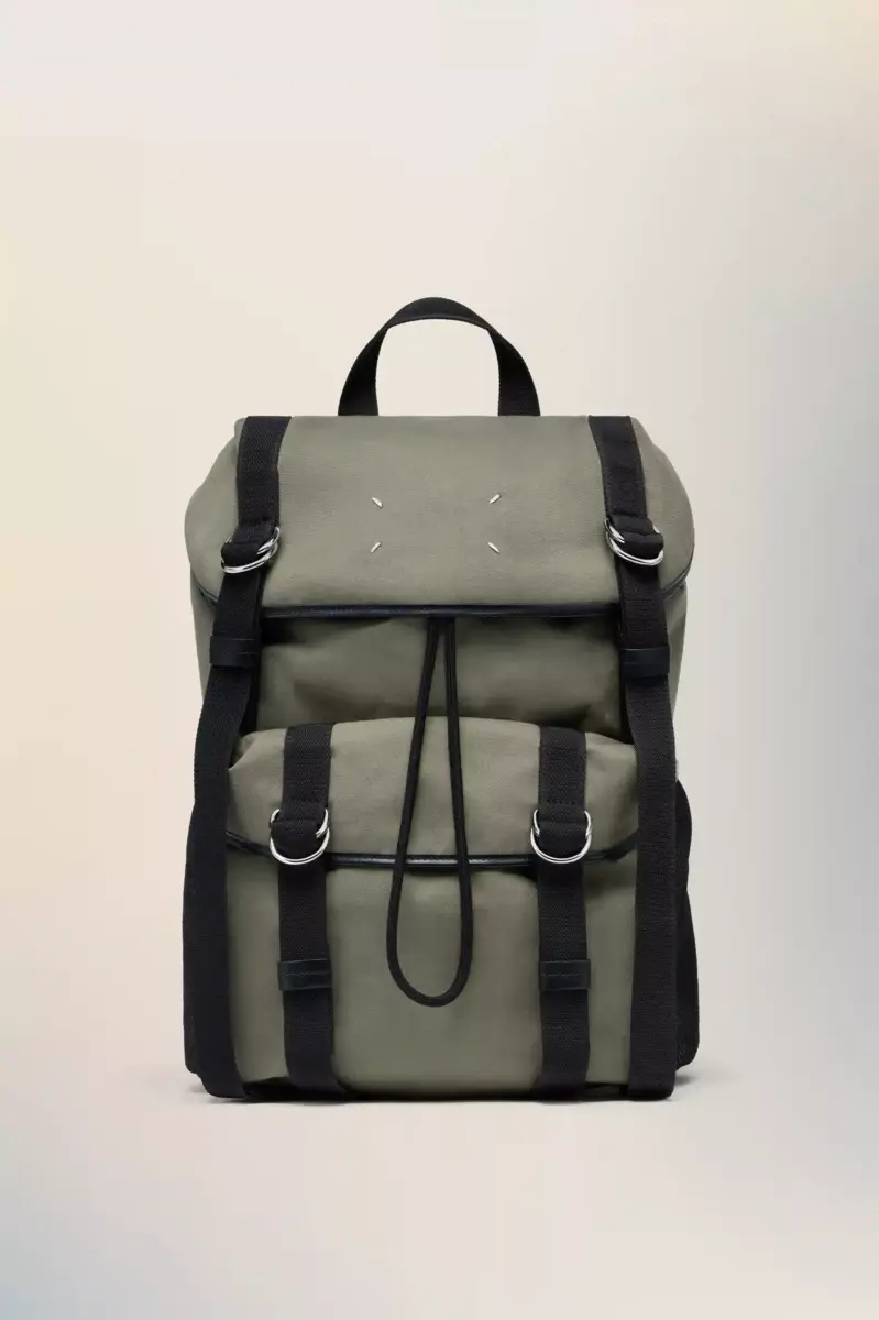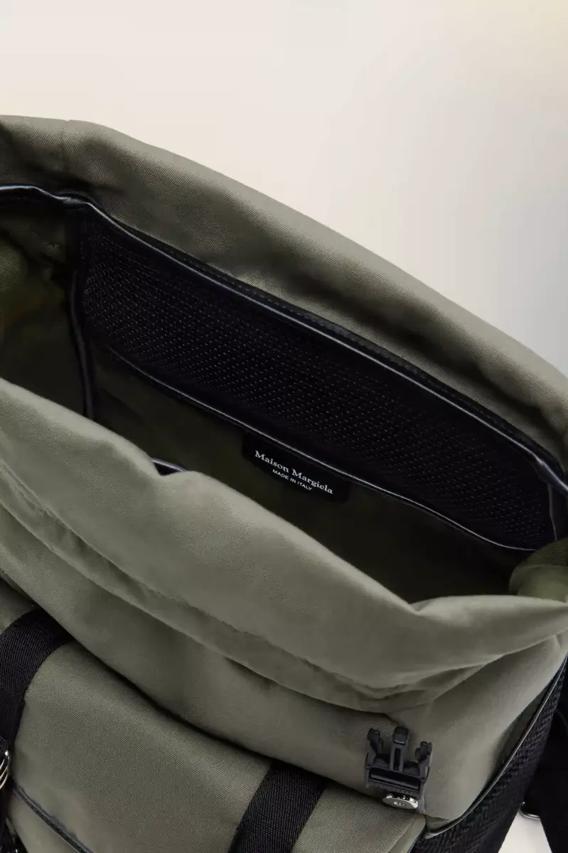 Questo zaino tecnico è progettato con una patta superiore strutturata, doppi spallacci anteriori e tasche laterali in rete per una maggiore traspirabilità. Una chiusura con coulisse protegge lo scomparto principale, mentre gli spallacci imbottiti ne aumentano il comfort. La firma della Maison, le quattro cuciture, è presente sul davanti; l’opposto di un’etichetta.