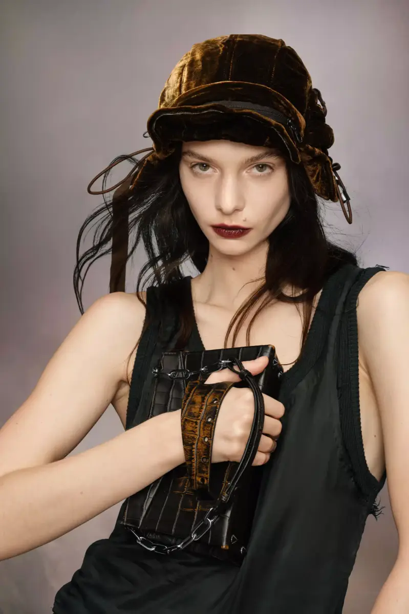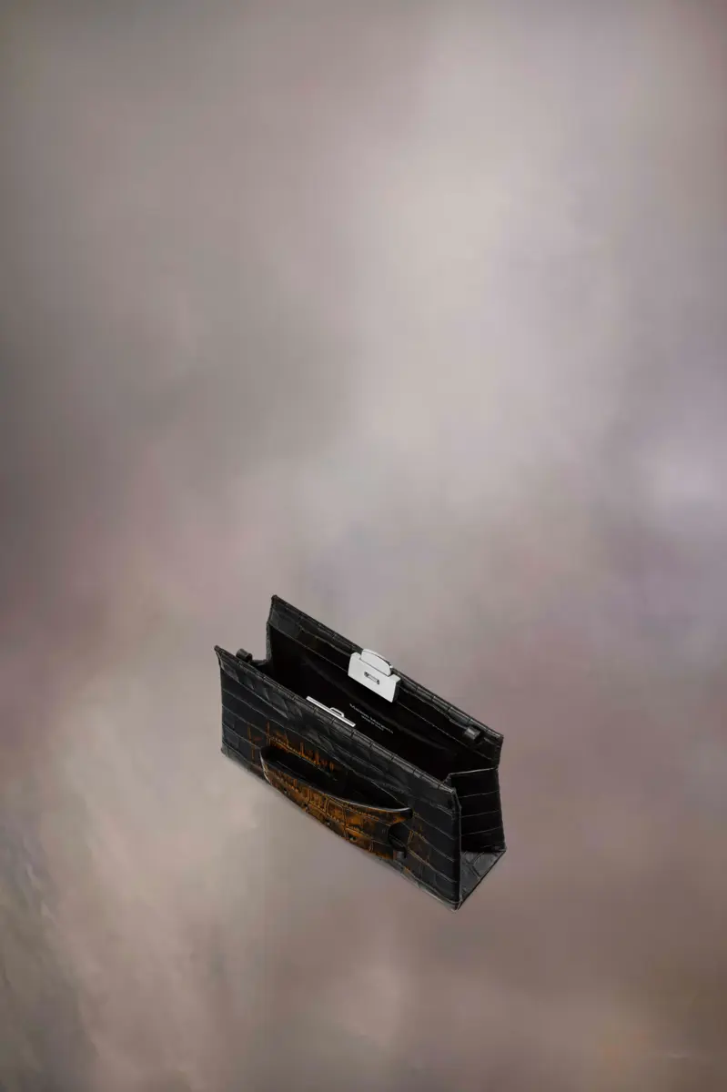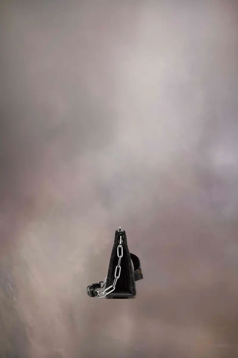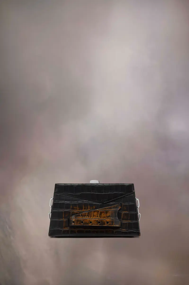 La piccola borsa a tracolla Snatched è realizzata in pelle stampa coccodrillo con colore a contrasto sul davanti. La Snatched ha debuttato nella collezione Artisanal AI19. Prende il nome dal termine colloquiale che significa “bello”, e anche dal modo in cui può essere tenuta in mano come una presa. Questa borsa genderless presenta una forma asimmetrica, ispirata agli origami. È dotata di tracolla a catena e manico frontale traforato per essere indossata come una pochette.