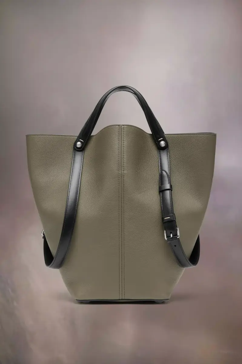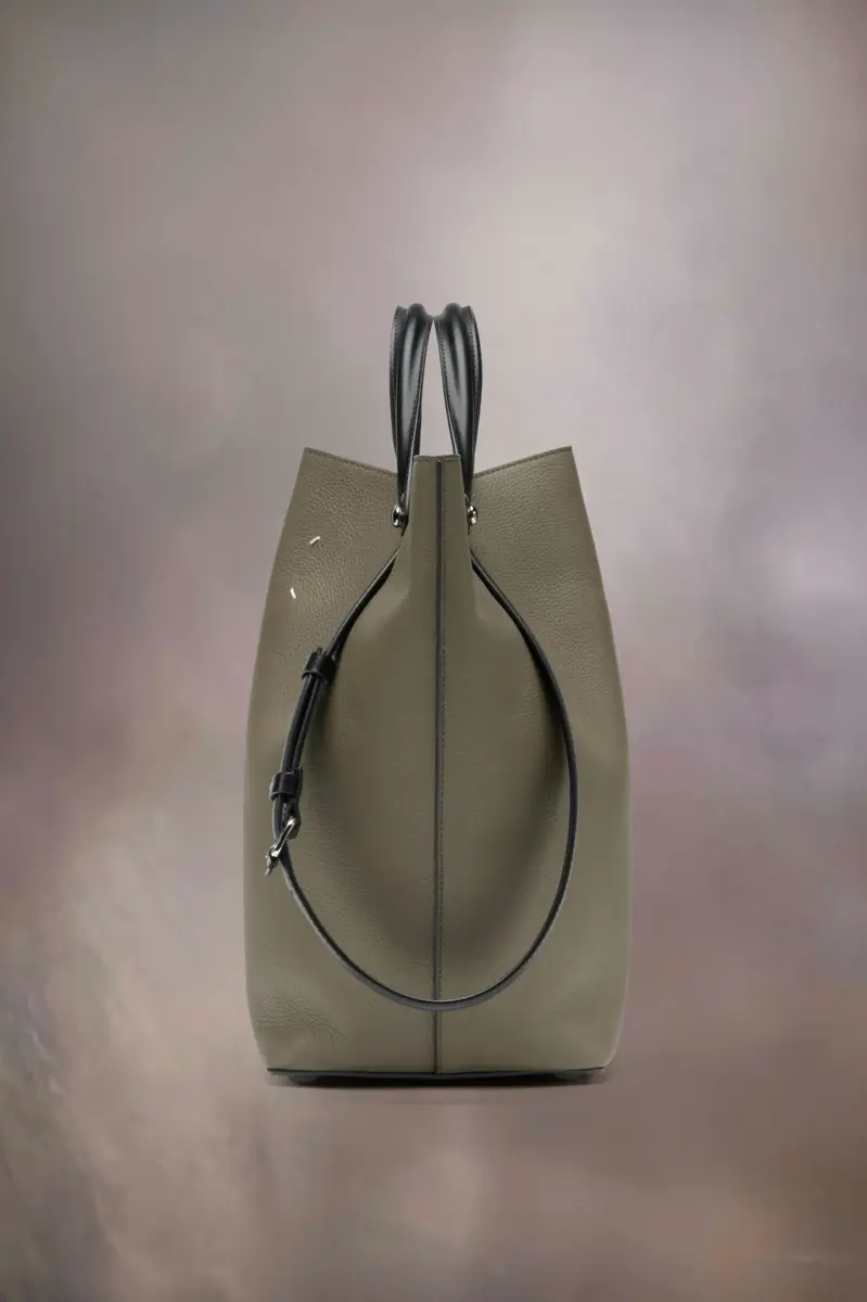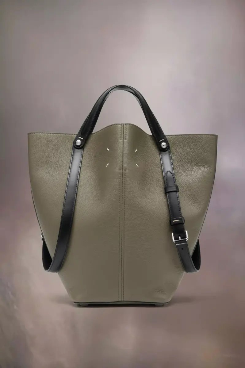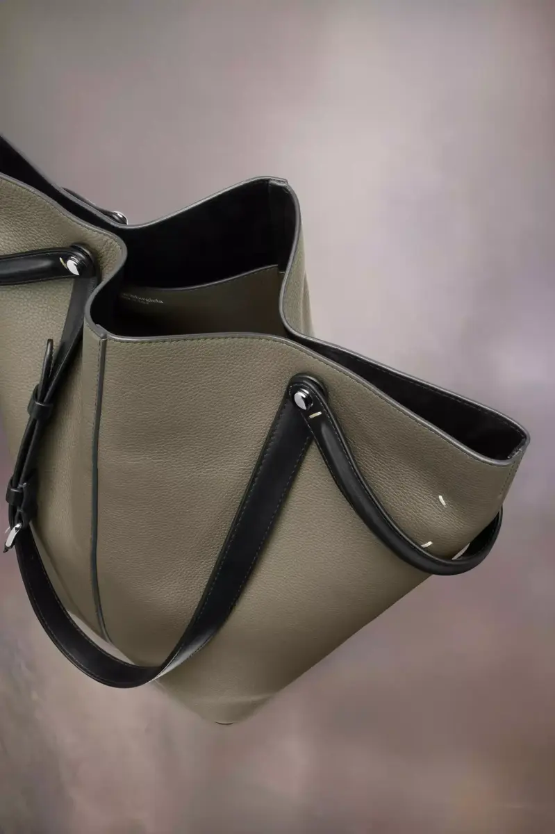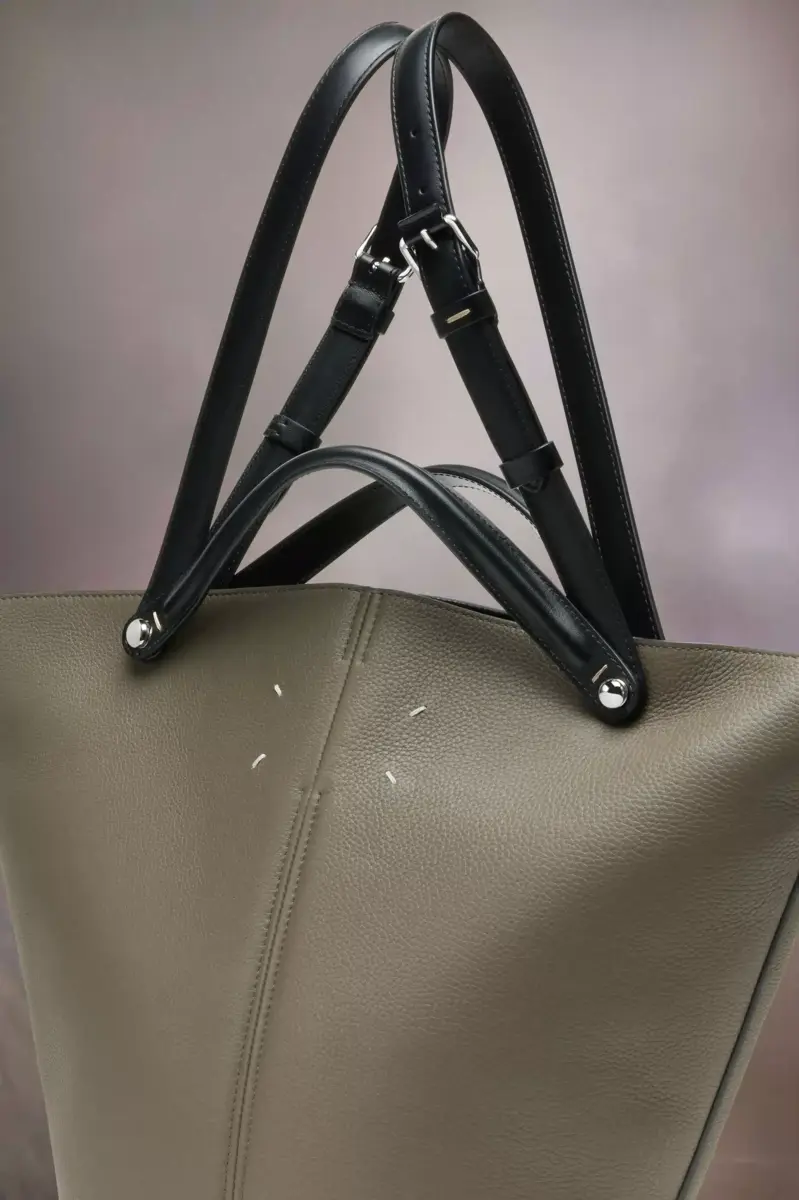 La Maison lancia la borsa Dress-age per la stagione PE25, realizzata in morbida pelle di vitello martellata. Con un tocco equestre, la borsa media presenta una lavorazione classica della pelle e linee raffinate, combinando glamour inconscio e design gestuale. Presenta una forma trapezoidale con dettaglio a contrasto della tracolla a doppia vestibilità. La base borchiata permette alla borsa di stare in piedi, e l’interno è decorato con il logo. La firma di Maison Margiela, le quattro cuciture, è visibile sul retro; l’opposto di un’etichetta.