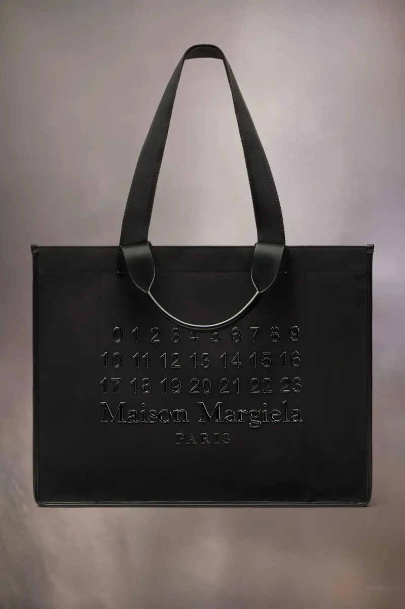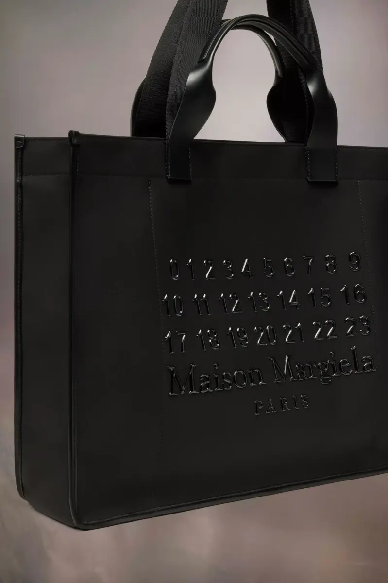 La grande borsa shopping Cabas, realizzata in tessuto Mackintosh con contrasto in pelle di vitello verniciata, è dotata di manici superiori lunghi e corti e di tasche interne. È decorata con il logo numerico Maison Margiela sul davanti.