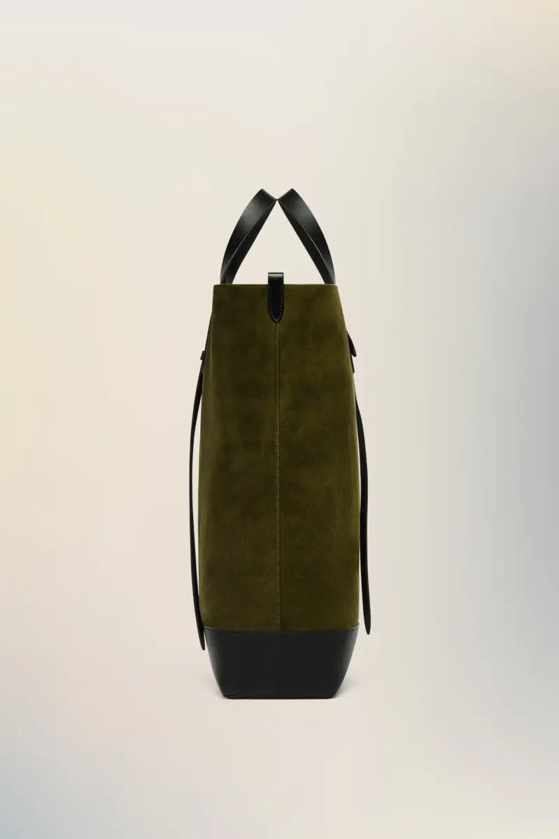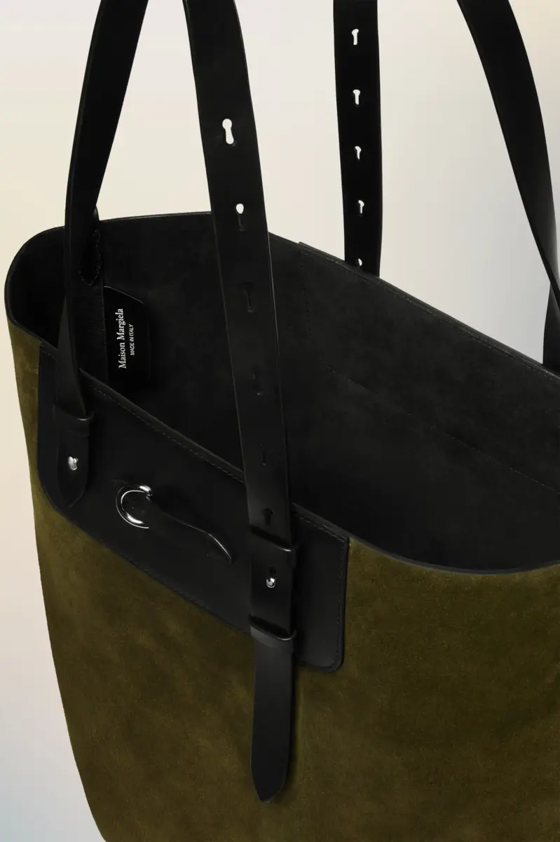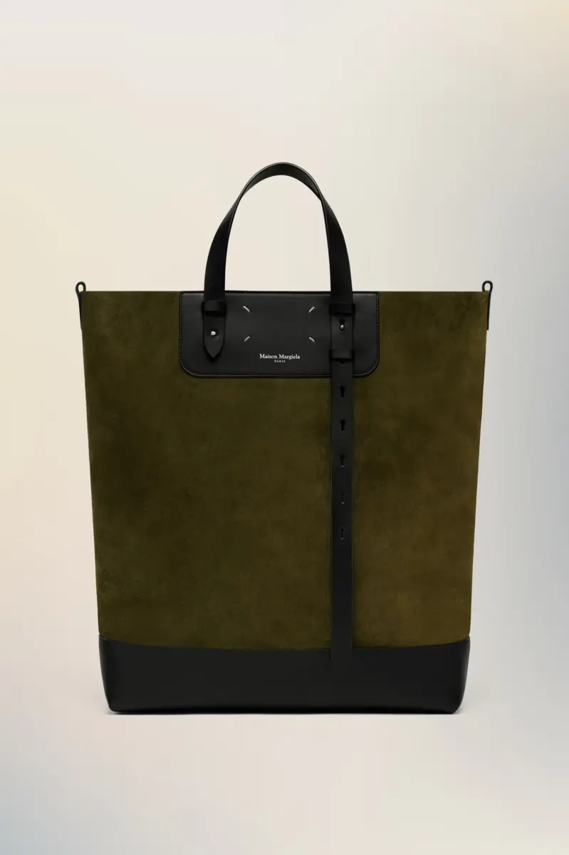 Questa tote esplora la tensione tra struttura e morbidezza, combinando un corpo flessibile con cinturini in pelle ispirati alla selleria. I manici superiori con cintura si regolano in lunghezza, mentre il dettaglio dell’anello a D e la fodera in suede grezzo alludono al design equestre. La firma della Maison, le quattro cuciture, è visibile sul retro; l’opposto di un’etichetta.