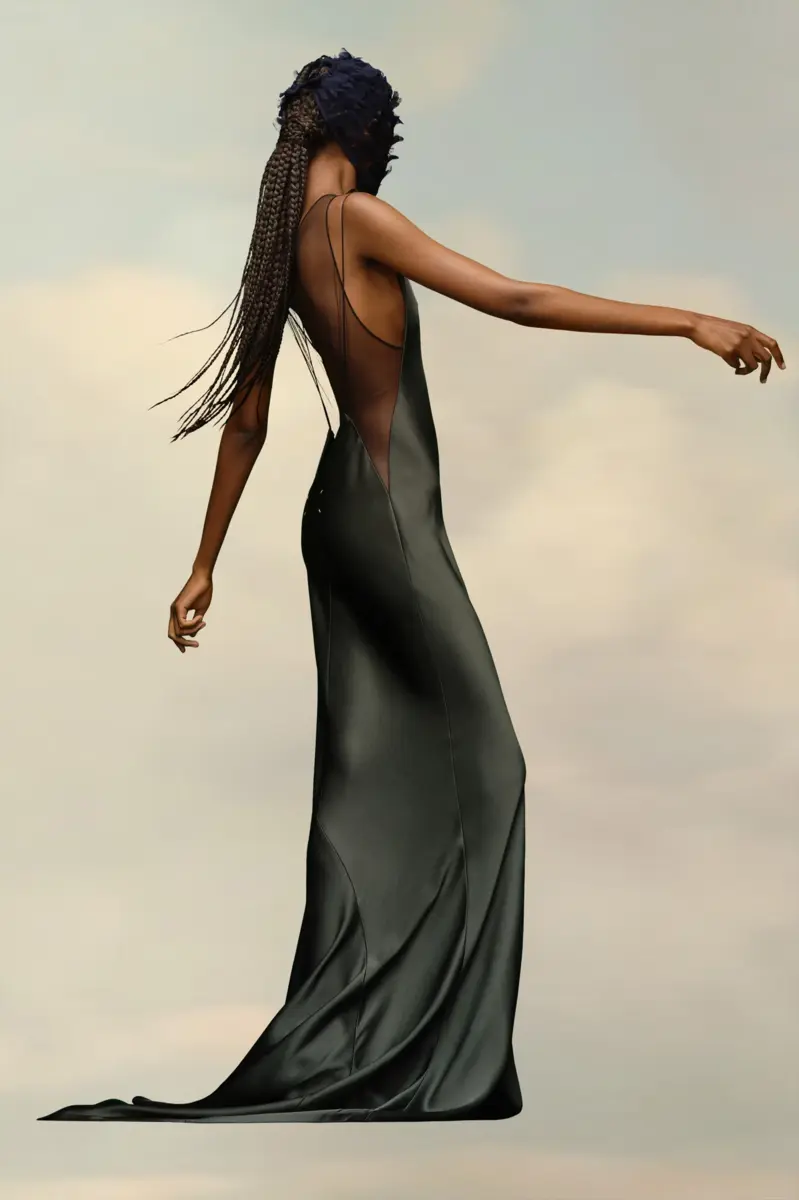 In raso martellato, questo maxi abito che arriva fino a terra, presenta un design senza maniche con scollo a barchetta. Pannelli trasparenti caratterizzano il petto e la schiena, con un ampio spacco. È rifinito con quattro cuciture bianche che mostrano la firma della Maison: l’opposto di un’etichetta.