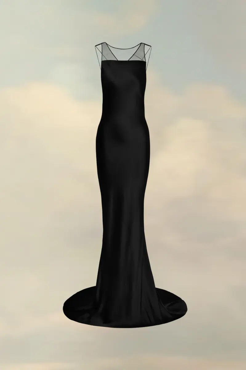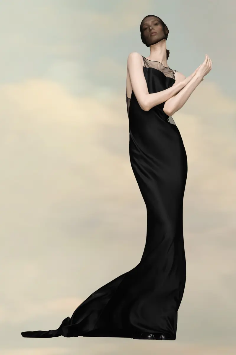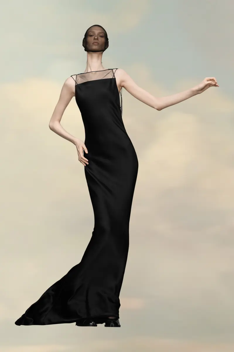 In raso martellato, questo maxi abito che arriva fino a terra, presenta un design senza maniche con scollo a barchetta. Pannelli trasparenti caratterizzano il petto e la schiena, con un ampio spacco. È rifinito con quattro cuciture bianche che mostrano la firma della Maison: l’opposto di un’etichetta.