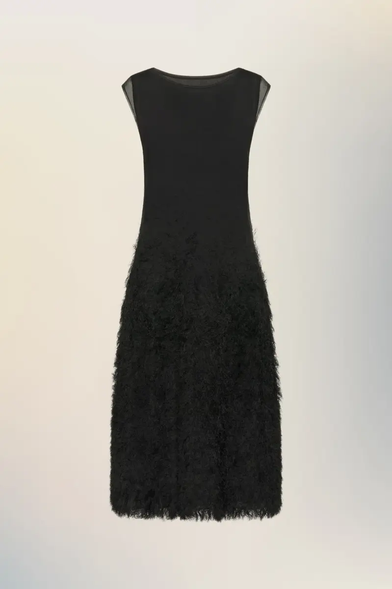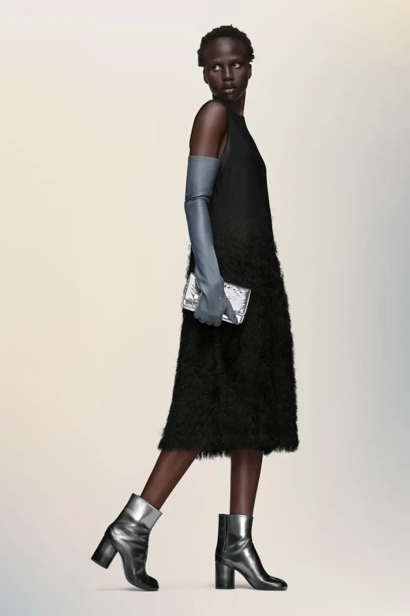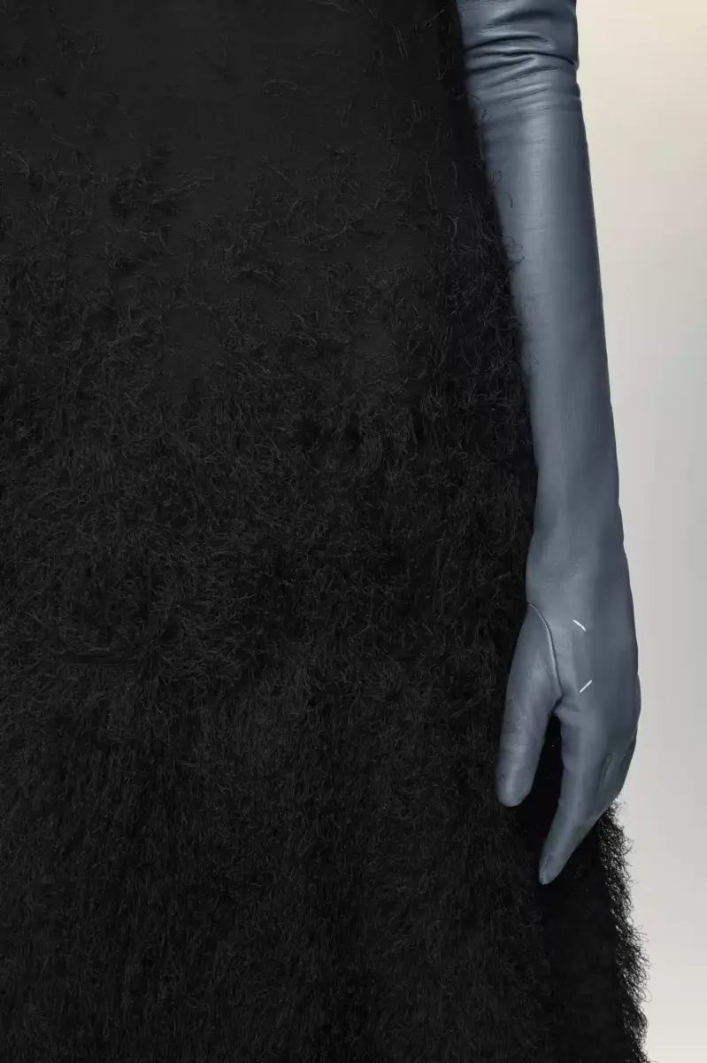 Realizzato in maglia di seta, questo abito senza maniche decostruisce la texture superficiale attraverso la tecnica Retrograding della Maison, dove densità e dettagli degradano dall’orlo alla scollatura. Il tessuto passa da una base morbida e voluminosa a una leggera garza nella parte superiore, evocando lo sbiadimento di uno schizzo incompiuto. Trasparente in ogni sua parte, il capo è sorretto da una fodera tono su tono staccabile, come quella di un abito sottoveste. Sul retro, compaiono le quattro cuciture, l’opposto di un’etichetta.