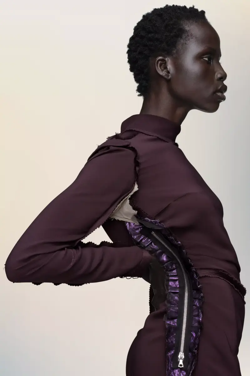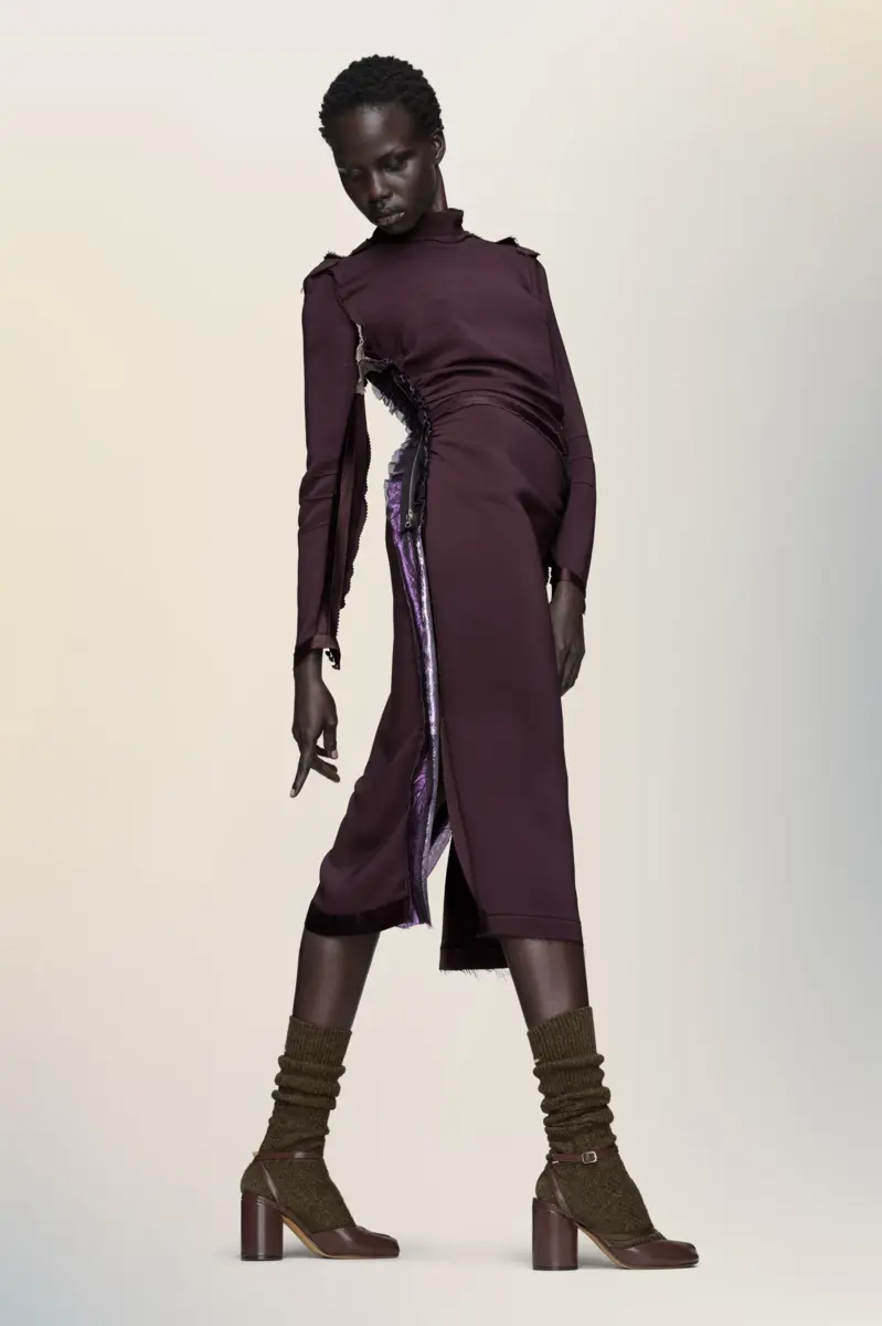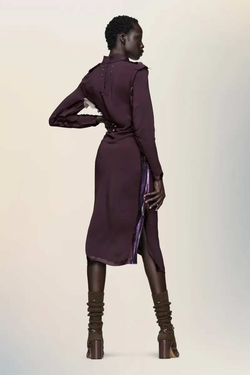 Con una silhouette scolpita, questo abito a maniche lunghe rivela bagliori di lamé metallico lungo le cuciture laterali. Le morbide arricciature lungo il corpo esaltano la forma, mentre le texture a contrasto aggiungono una sottile dimensione. Il segno distintivo di Maison Margiela, i quattro punti, è visibile sul retro; l’opposto di un’etichetta.