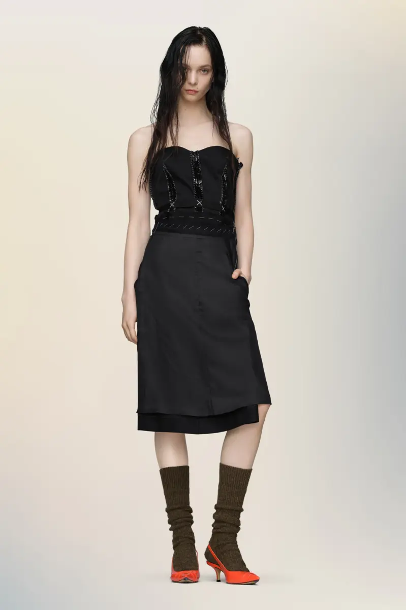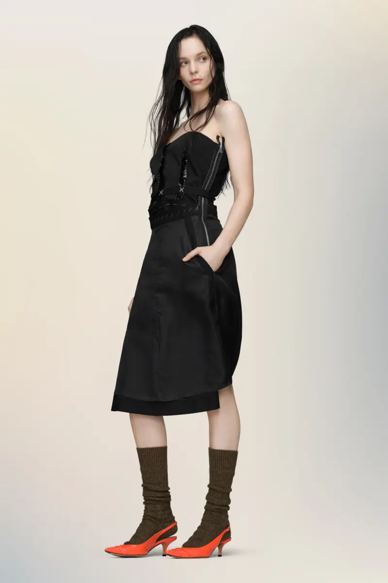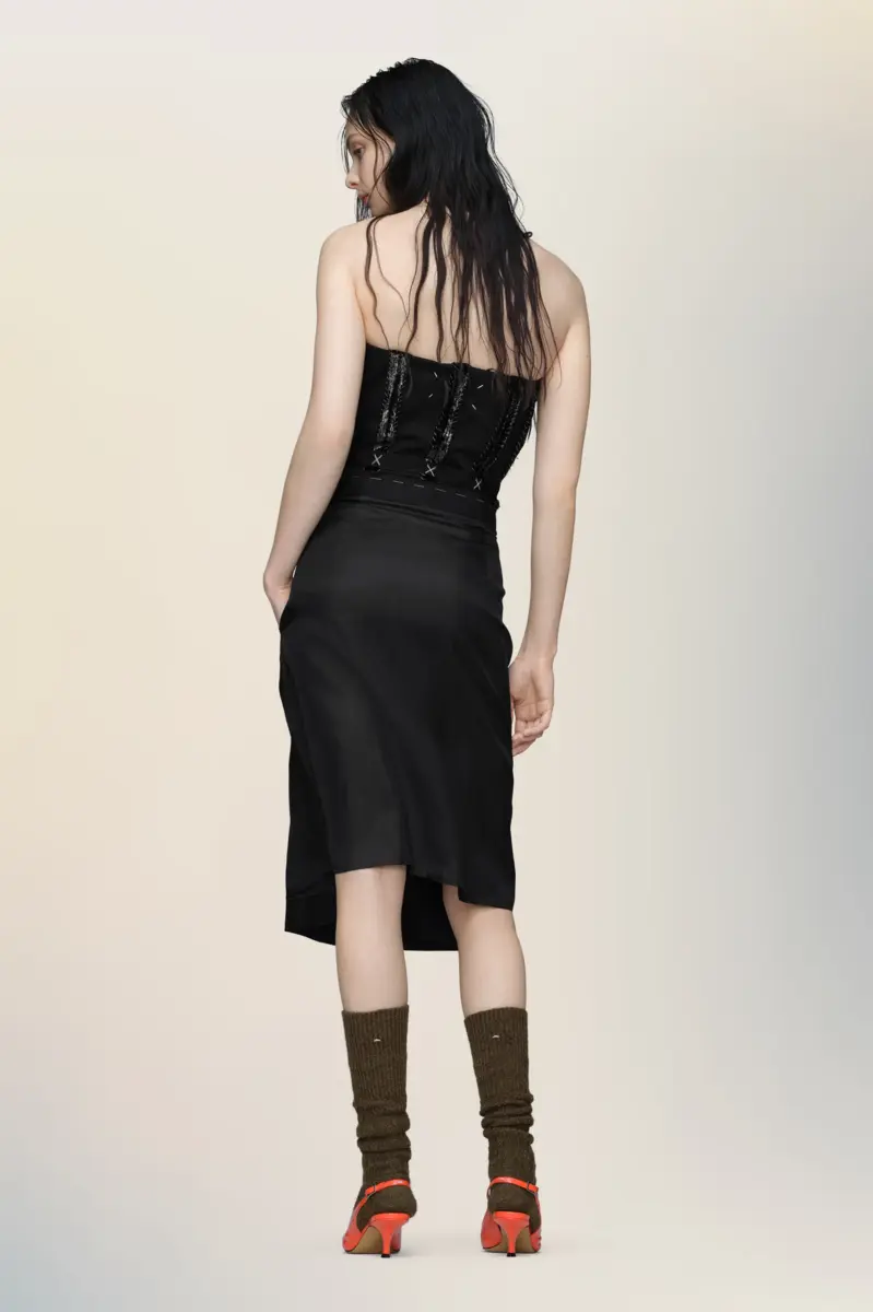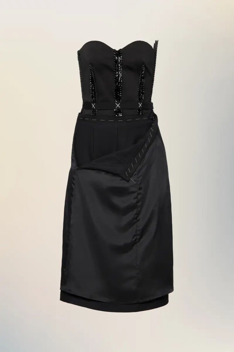 Questo abito senza spalline esplora la struttura attraverso il contrasto: un corpetto scolpito, dettagliato con stecche a vista e decorazioni cucite, è ancorato a una gonna destrutturata. La zip frontale consente uno stile versatile, mentre l’anonimato della fodera della Maison mette in mostra sottilmente l’architettura interna del capo. La firma di Maison Margiela, le quattro cuciture, appare sul retro; l’opposto di un’etichetta.