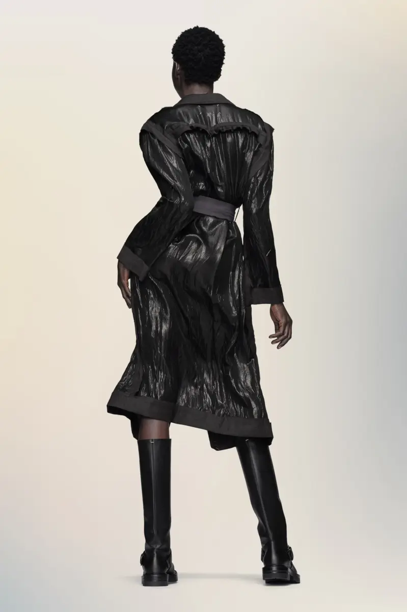 Una rivisitazione del trench in lamé stropicciato, questo capo offre un gioco tattile di opaco e lucido. I dettagli décortiqué sulle spalle evidenziano le strutture nascoste, mentre i profili tono su tono e una cintura strutturata incorniciano la silhouette. La proposta rovesciata rivela una nuova forma: un cappotto che diventa un abito. La firma di Maison Margiela, le quattro cuciture, appare sul retro; l’opposto di un’etichetta.