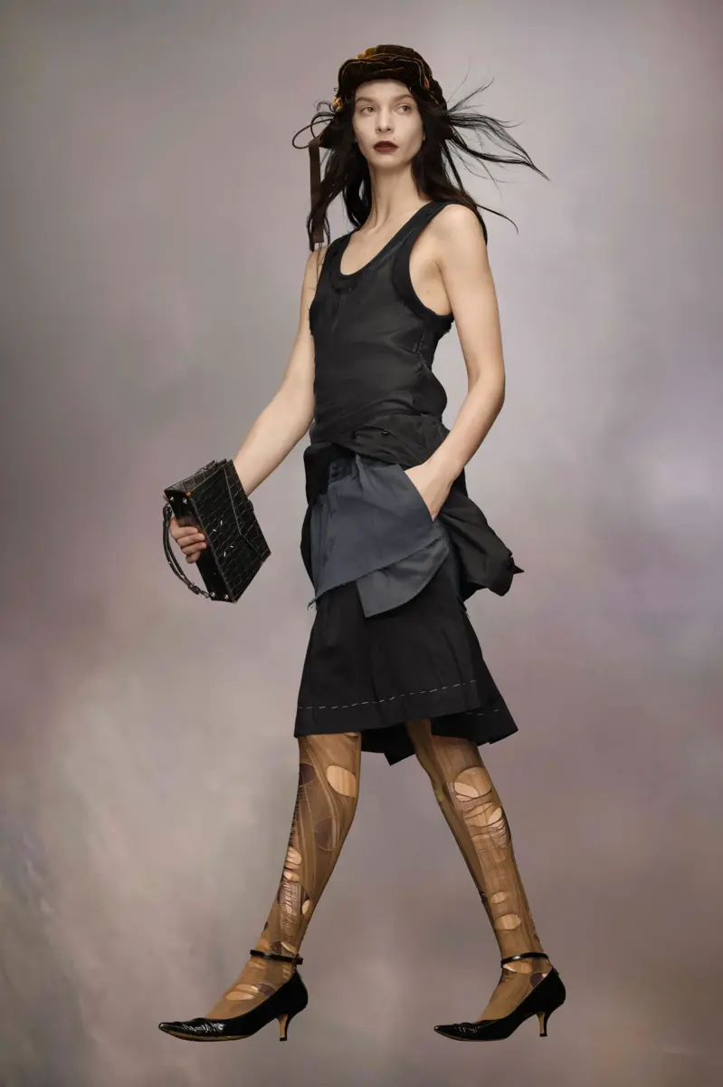 Vero e proprio esperimento della tecnica di fodera anonima della Maison, l’abito in viscosa e cotone mette in mostra strati a vista. La prima gonna è tagliata al ginocchio con cuciture in lavorazione lungo l’orlo, con un secondo strato tagliato per rivelare le tasche. Il terzo strato, una camicia rielaborata, crea una silhouette esagerata, mentre la parte superiore dell’abito presenta una scollatura a cucchiaio a doppio strato. La firma di Maison Margiela, le quattro cuciture, è visibile sul retro; l’opposto di un’etichetta.