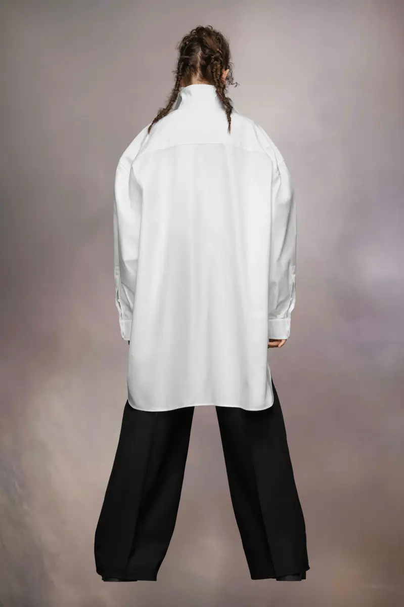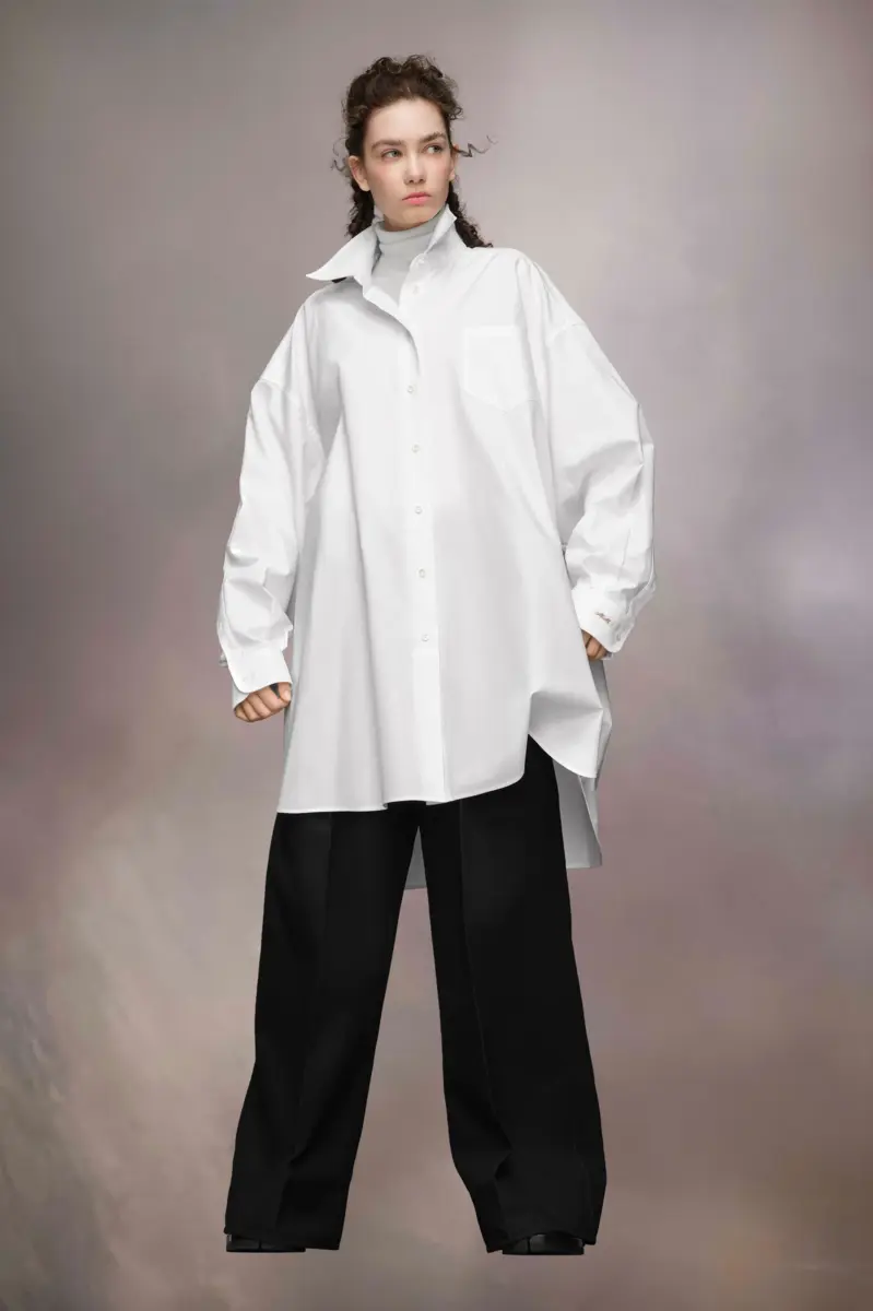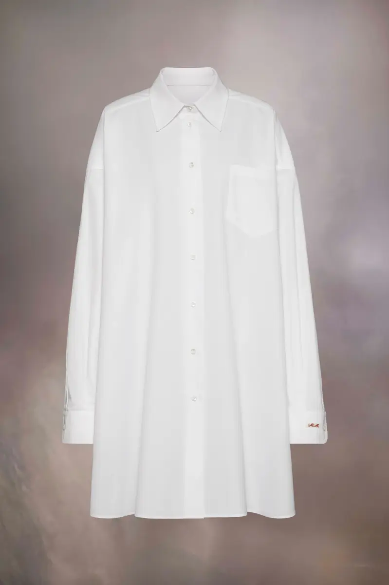La camicia lunga è realizzata in popeline di cotone con colletto classico, tasca applicata e orlo curvo. La firma di Maison Margiela, i Quattro punti, è presente sul retro, l’opposto di un’etichetta.