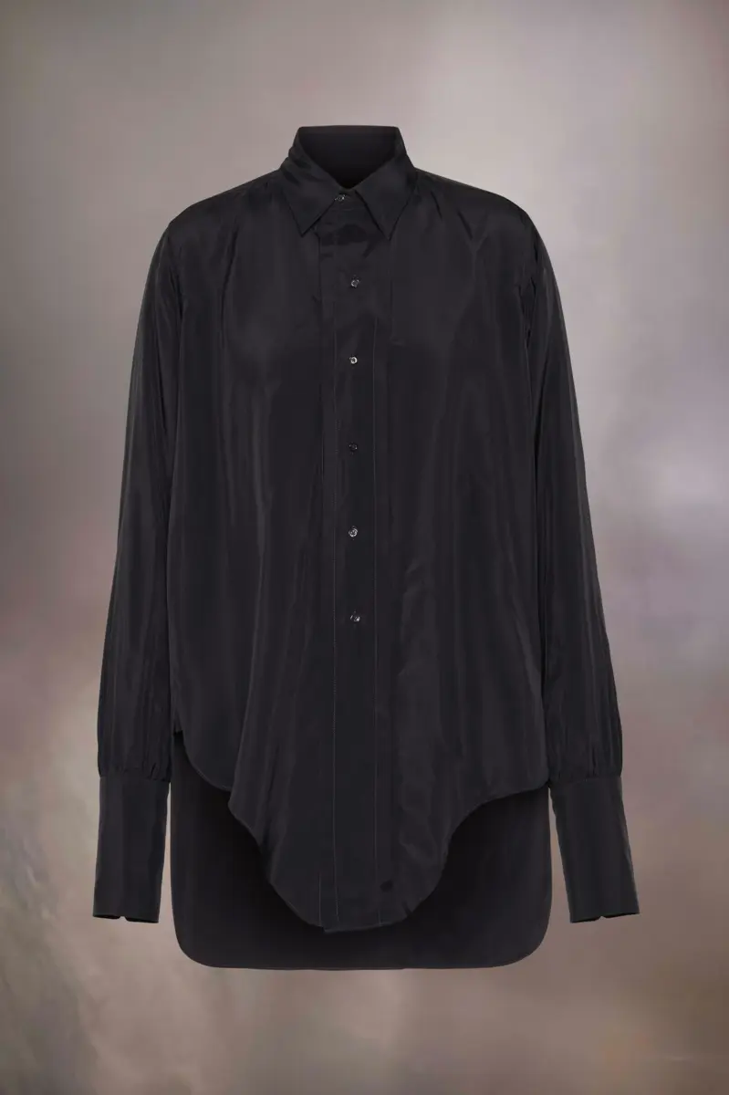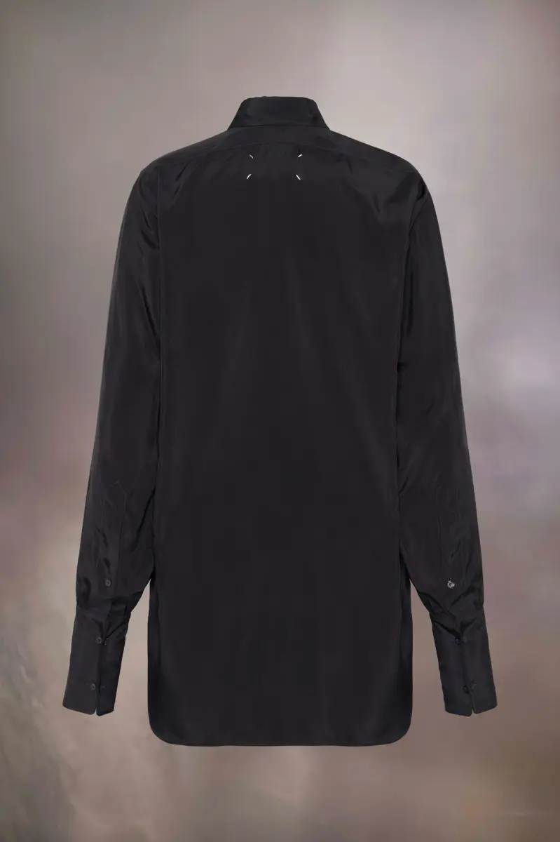 La camicia è realizzata in viscosa-rayon e presenta un orlo più lungo e curvo sul retro e un orlo inclinato sul davanti per rinnovare la silhouette classica. È progettata con un’ampia abbottonatura con bottoni e polsini lunghi con altri tre bottoni. La firma di Maison Margiela, le quattro cuciture, è presente sul retro, l’opposto di un’etichetta.