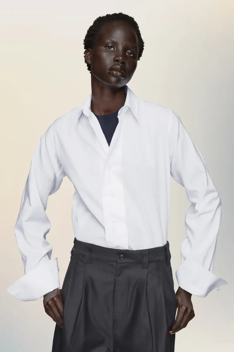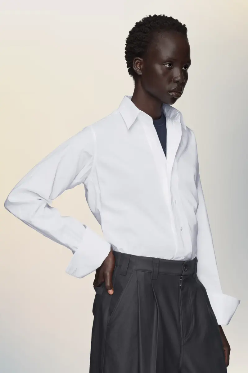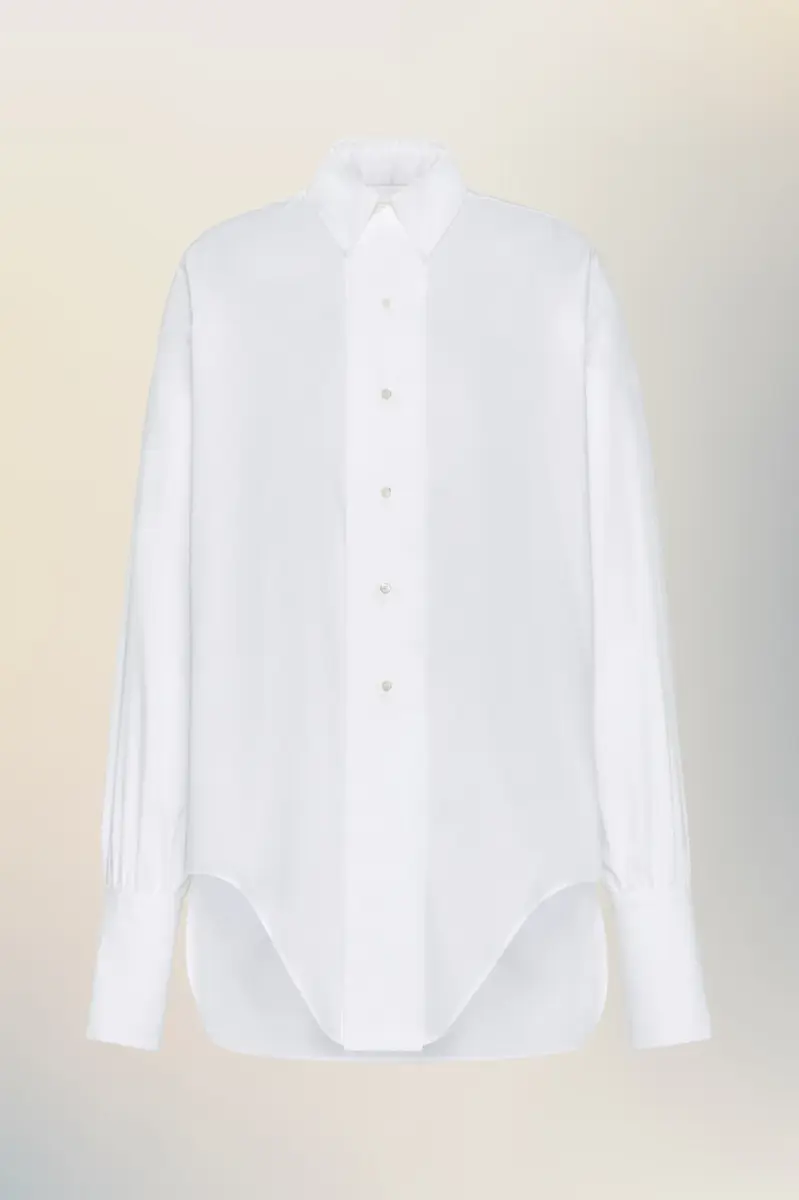 Questa camicia in cotone gioca con le proporzioni, creando una silhouette pulita partendo da elementi classici: colletto a punta, polsini oversize e orlo curvo. Componenti familiari, ristrutturati. Sul retro, compaiono i quattro punti distintivi della Maison; l’opposto di un’etichetta.