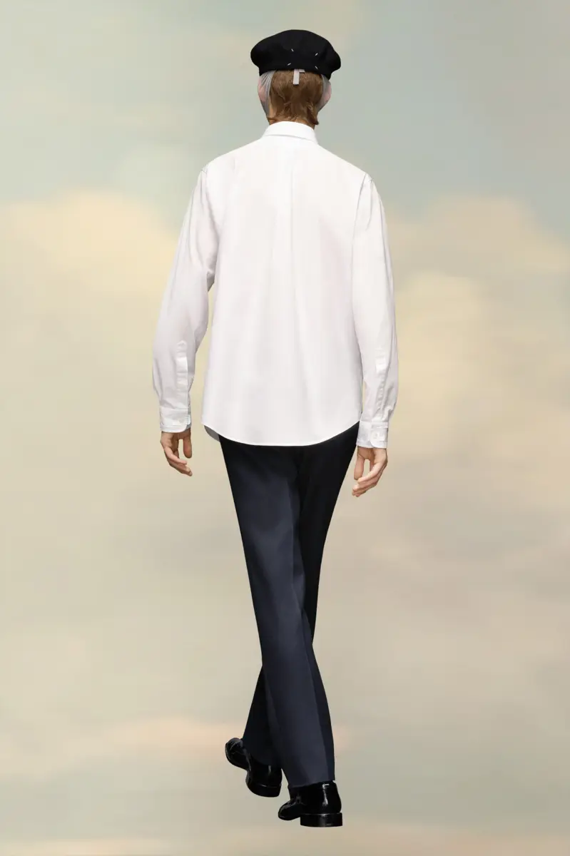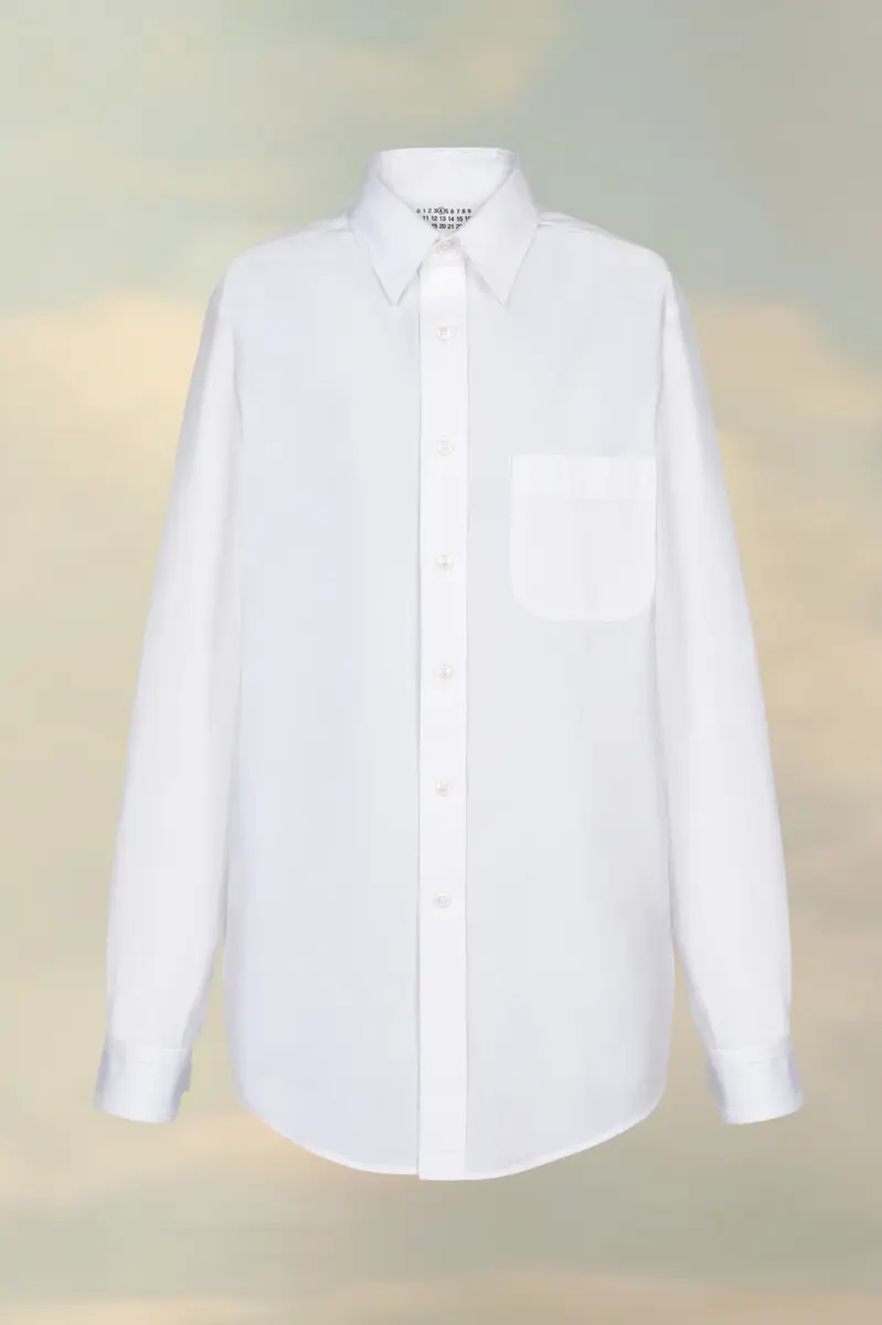 La classica camicia a maniche lunghe in popeline di cotone ecologico con colletto, patta con bottoni e taschino sul petto. La firma di Maison Margiela, le quattro cuciture, è visibile sul retro, l’opposto di un’etichetta.