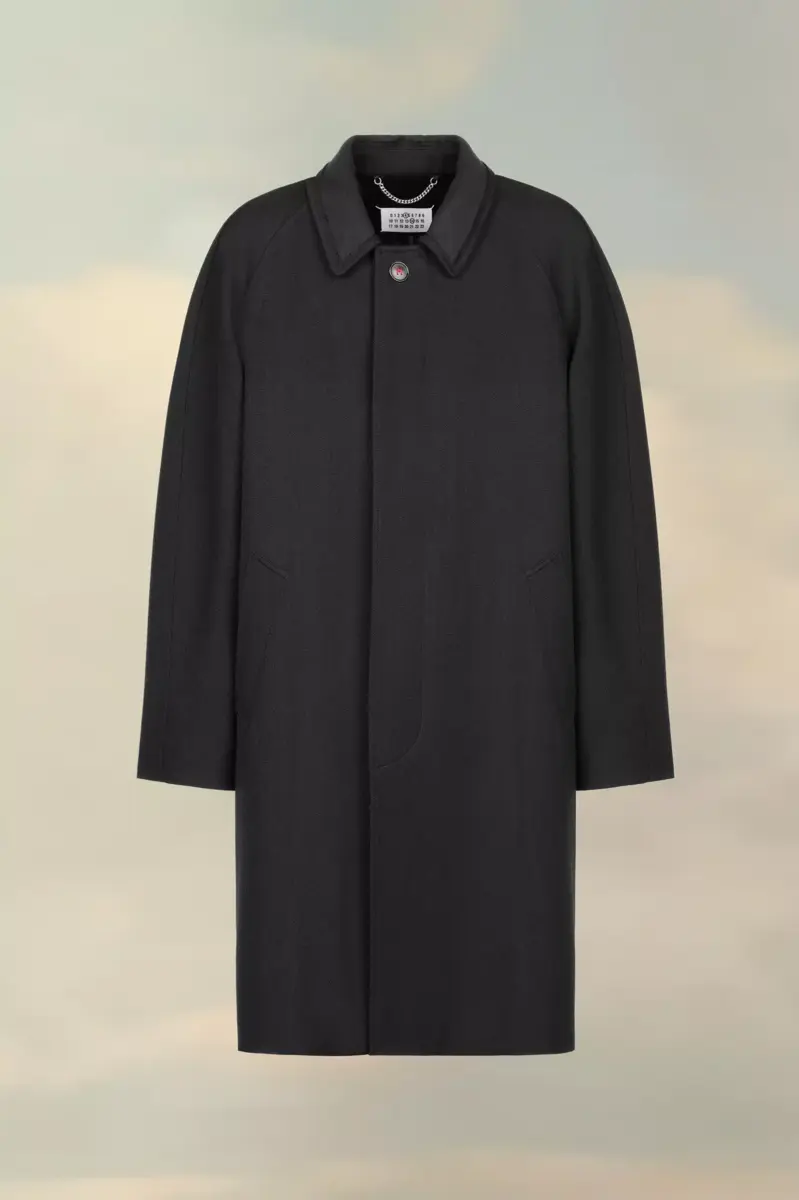 Realizzato in lana e viscosa, il cappotto presenta un colletto a contrasto e un bottone nella parte superiore con patta nascosta per un aspetto pulito. Un unico spacco completa il design. La firma di Maison Margiela, le quattro cuciture, è visibile sul retro, l’opposto di un’etichetta.