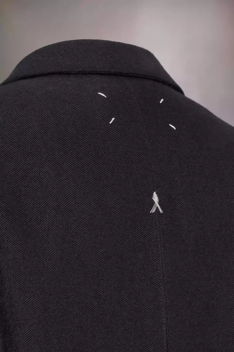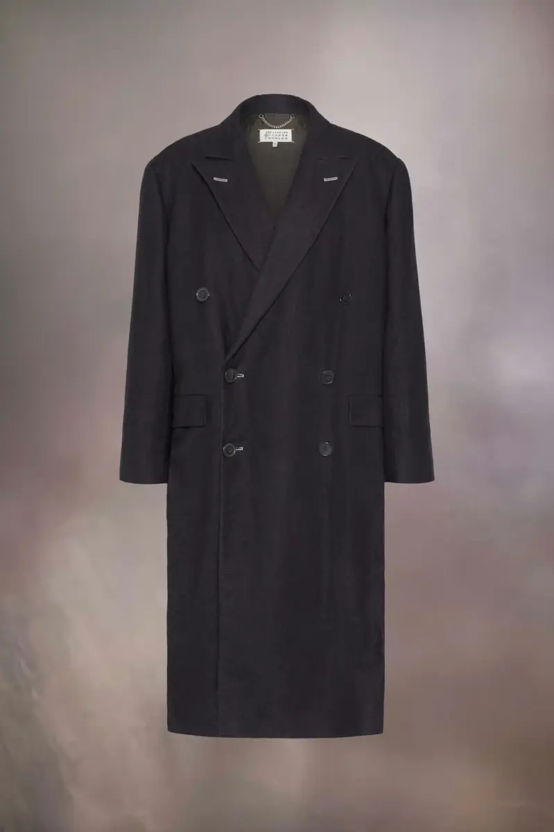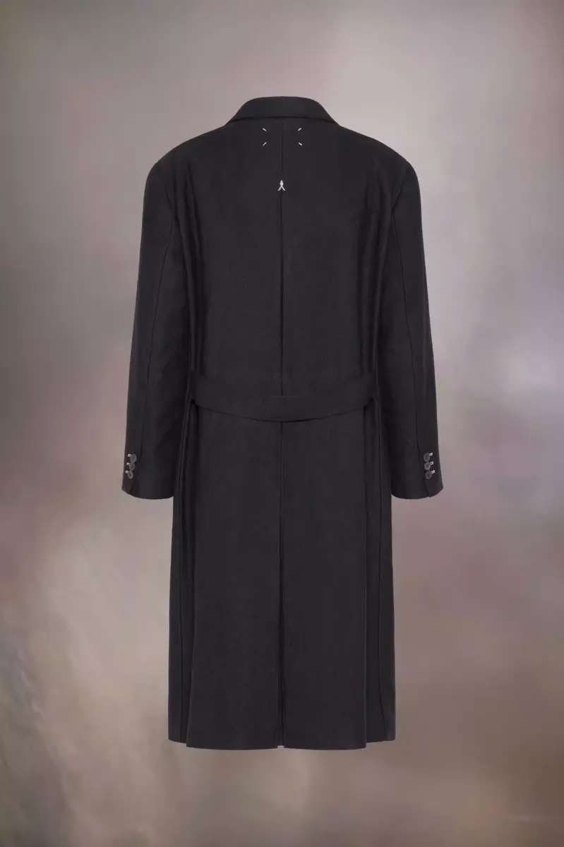 Ispirato ai classici capispalla da uomo, il lungo cappotto in misto lino e lana intrecciato ha una silhouette oversize che conferisce un tocco di stile disinvolto. Cuciture a contrasto “work-in-progress” sono visibili ovunque, con cintura posteriore e piega a cannoncino invertita, doppiopetto e tasche con patta. La firma di Maison Margiela, i quattro punti, è visibile sul retro; l’opposto di un’etichetta.