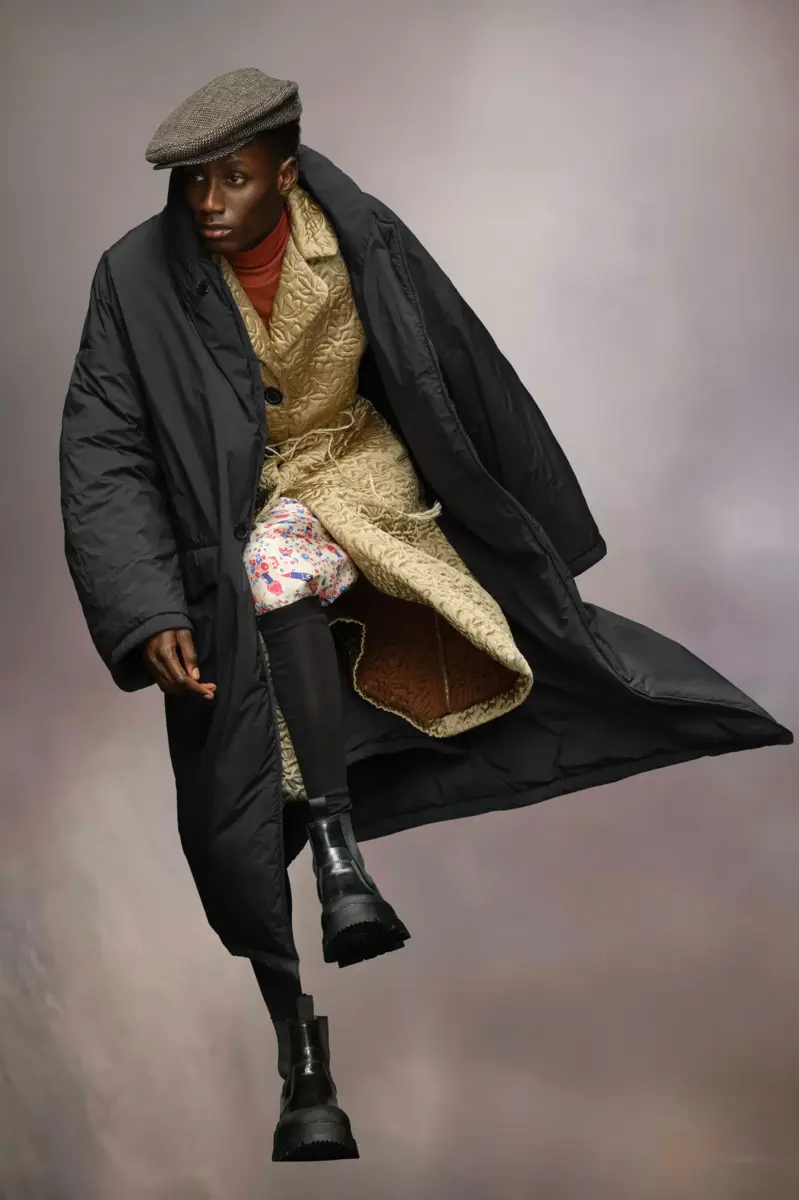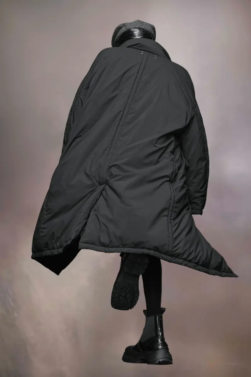 Questo cappotto imbottito oversize di media lunghezza è realizzato in tessuto riciclato, con collo alto e spacco posteriore. La firma di Maison Margiela, le quattro cuciture bianche, è visibile sul retro, l’opposto di un’etichetta.