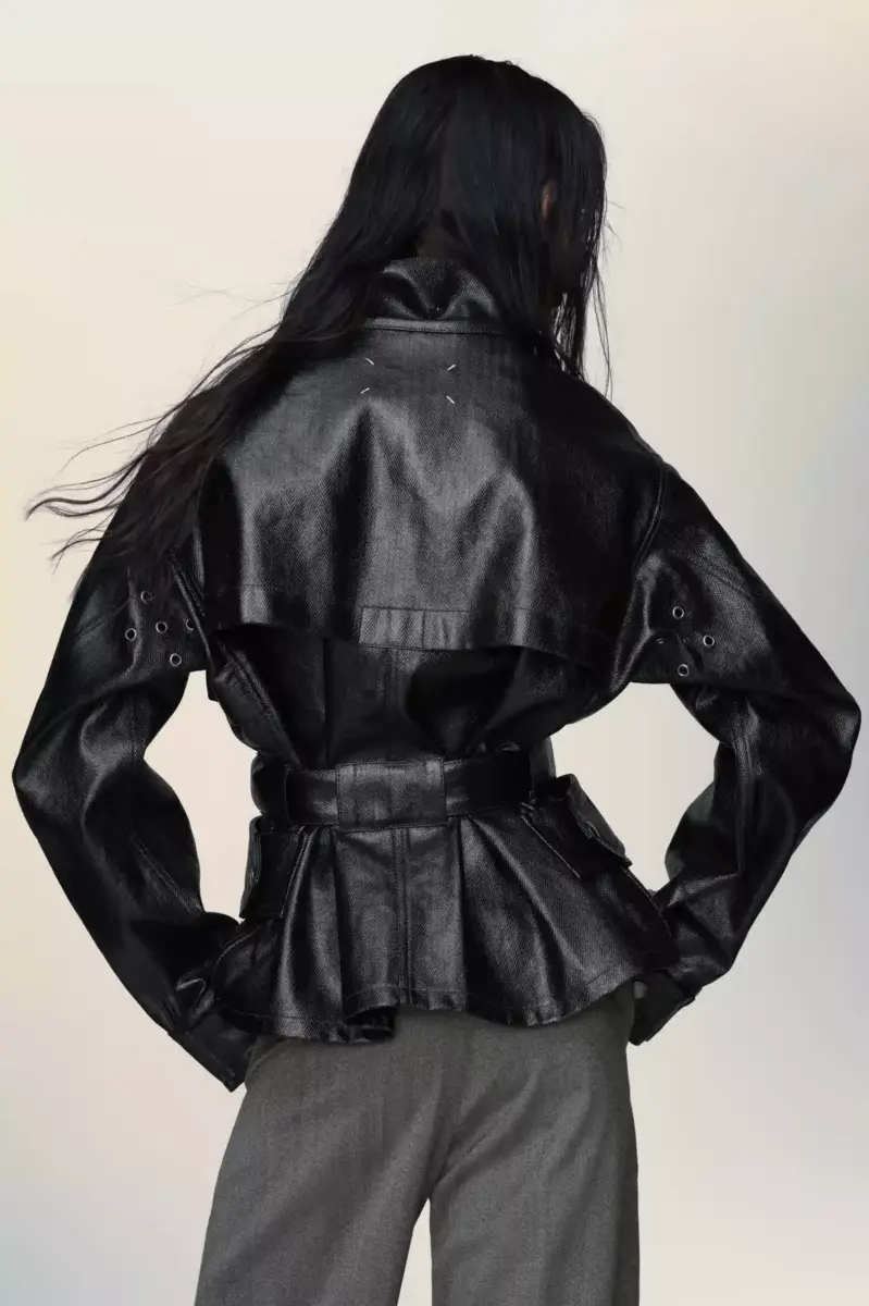 Realizzata in cotone laminato, questa giacca gioca con la luce e le forme. La superficie spalmata ne esalta il taglio funzionale, con tasche a patta, bottoni automatici e vita stretta, mentre il movimento rivela una texture a spina di pesce tattile sotto la lucentezza. La firma di Maison Margiela, i quattro punti, è visibile sul retro; l’opposto di un’etichetta.