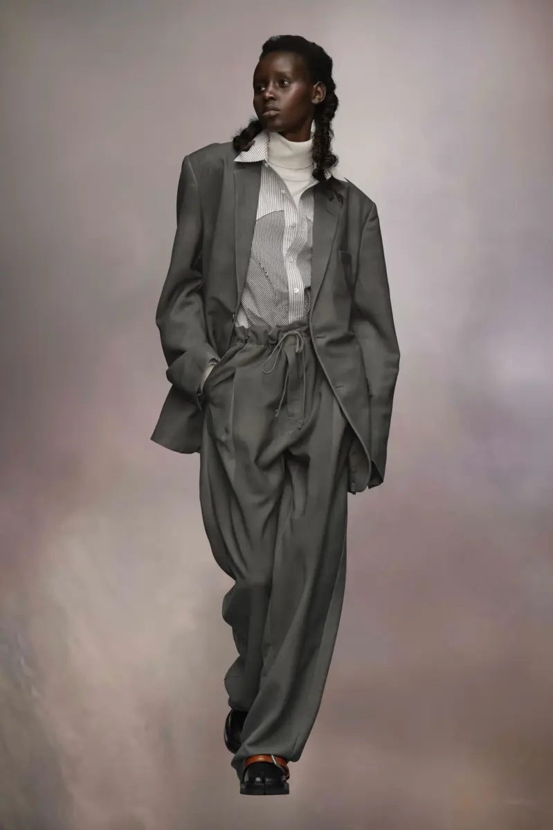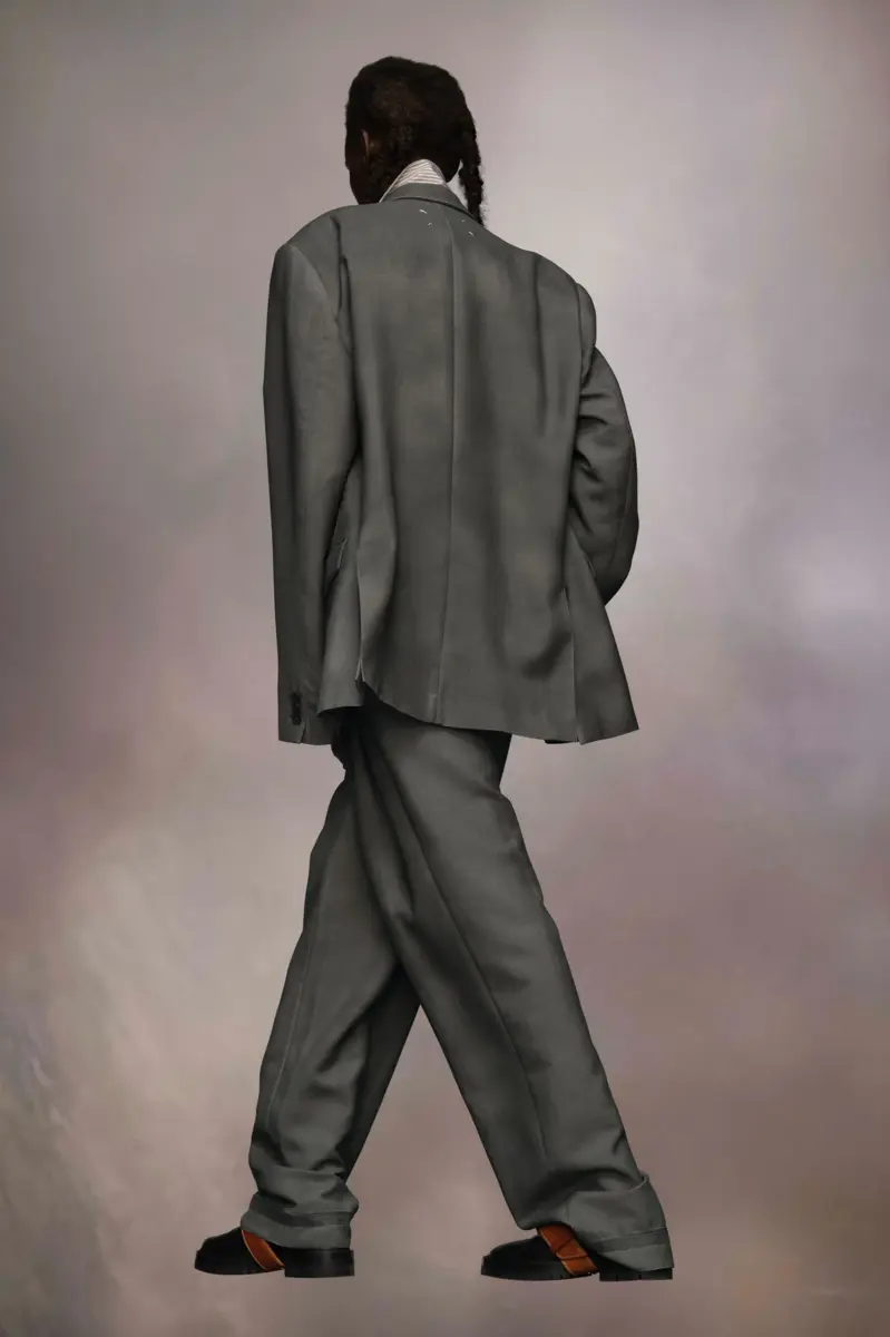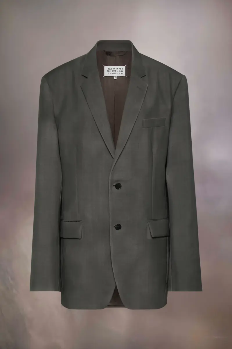 Il blazer con colletto a lancia è realizzato in misto lana e mohair con tecnica di patinatura grassa applicata a mano per un effetto vissuto e irregolare. Con chiusura monopetto, la giacca è rifinita con taschino sul petto, tasche con patta e senza spacco posteriore per una silhouette pulita. Il segno distintivo di Maison Margiela, i Quattro punti, è visibile sul retro; l’opposto di un’etichetta.