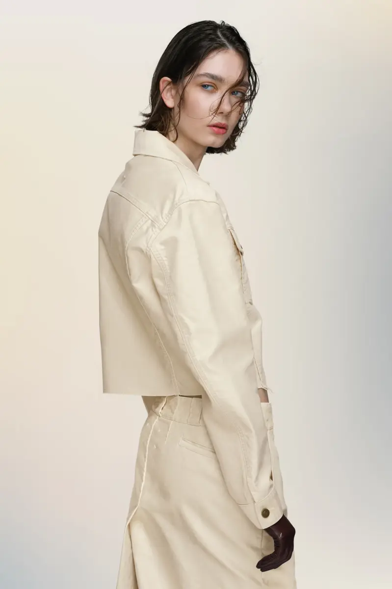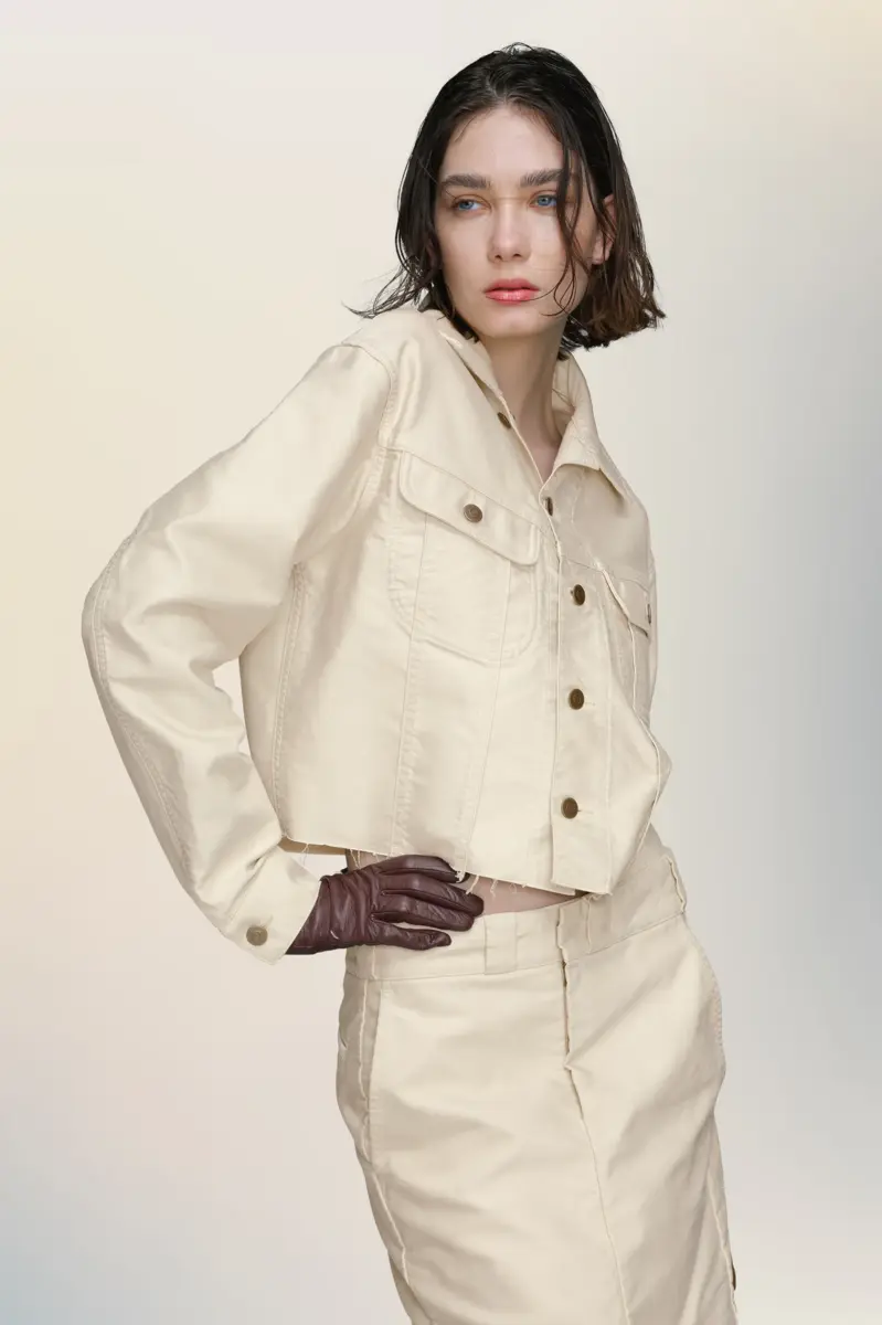 Realizzata in fustagno di cotone, questa giacca corta condensa l’approccio decostruttivo della Maison in una silhouette essenziale. Orli grezzi e cuciture a vista reinterpretano il classico abbigliamento da lavoro attraverso proporzioni alterate e finiture minimali. La firma di Maison Margiela, i quattro punti, è visibile sul retro, l’opposto di un’etichetta.