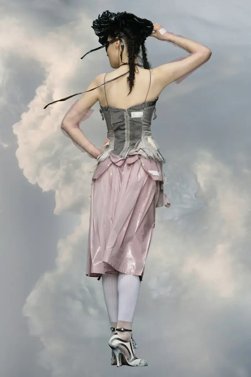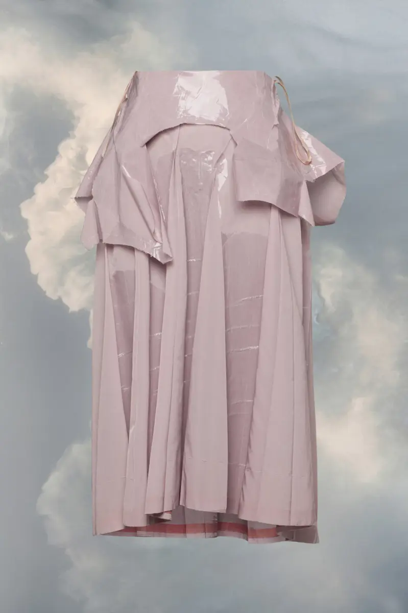 La gonna midi in taffetà di nylon è laminata con una vernice lucida. Presenta un Décortiqué destrutturato, con la parte superiore dell’abito ripiegata per formare uno strato superiore della gonna. Le cuciture in lavorazione sono visibili per un’estetica non finita. I quattro punti distintivi di Maison Margiela compaiono sul retro, l’opposto di un’etichetta.