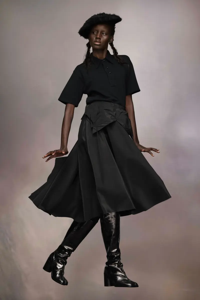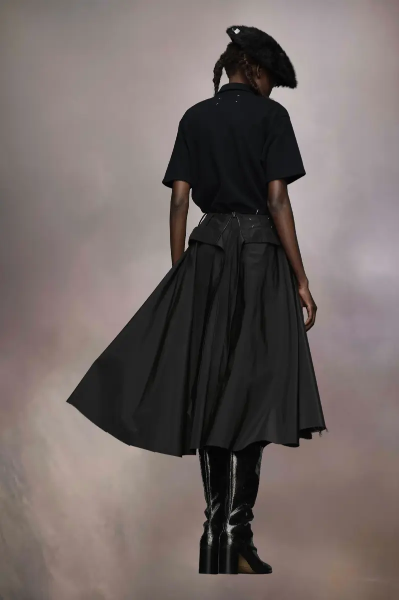 Realizzata in taffetà di poliestere, la voluminosa gonna midi presenta una parte anteriore ripiegata, che rielabora la silhouette; completata dalle cuciture Work-in-progress della Maison. Il retro presenta un fiocco e una cerniera aperta per accentuare l’estetica non finita. La firma di Maison Margiela, i Quattro punti, è presente sul retro, l’opposto di un’etichetta.