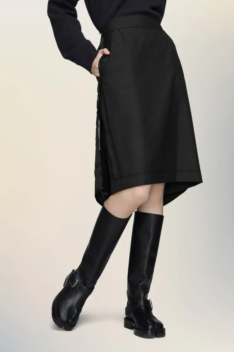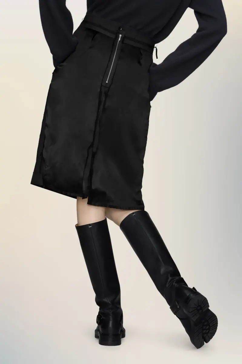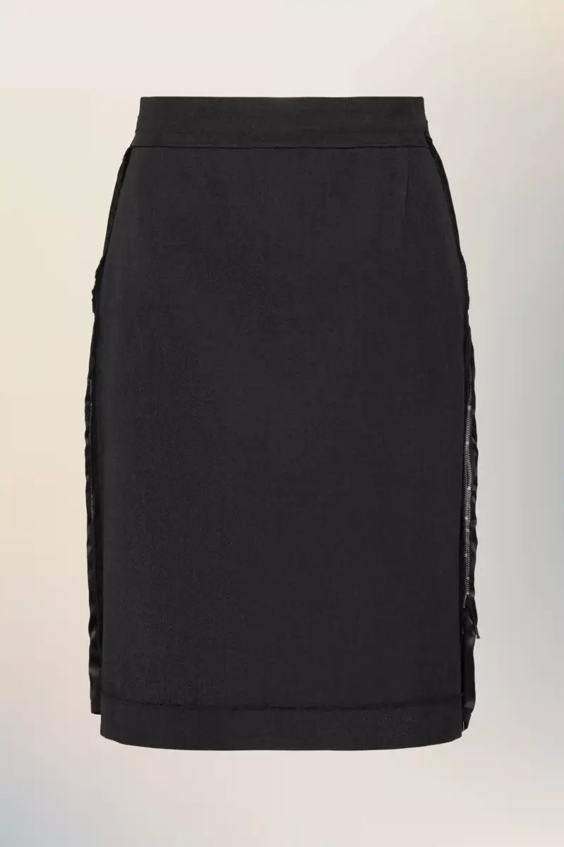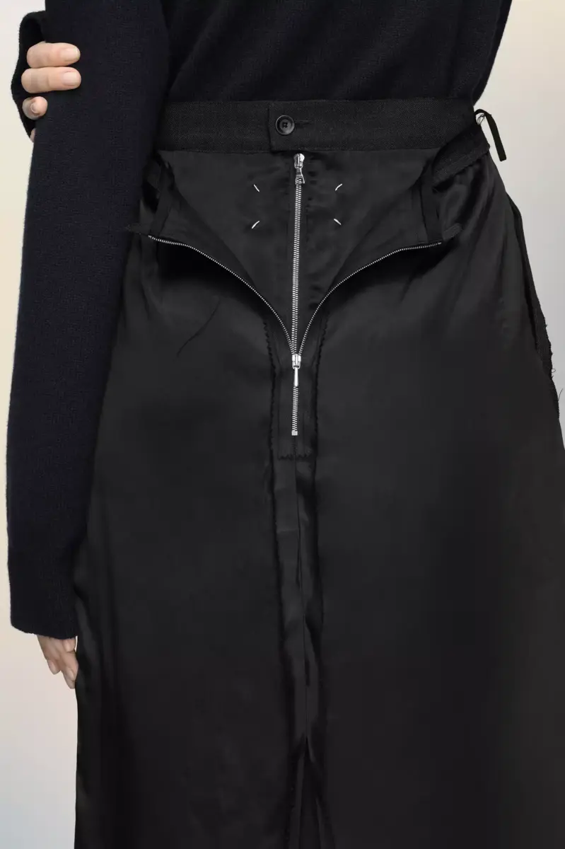Definita da linee pulite e costruzione minimalista, questa gonna a tubino ha una silhouette strutturata con bordi laterali tono su tono per un sottile contrasto. Una zip aperta sul retro aggiunge versatilità alla vestibilità e allo stile. La firma di Maison Margiela, le quattro cuciture, è visibile sul retro; l’opposto di un’etichetta.