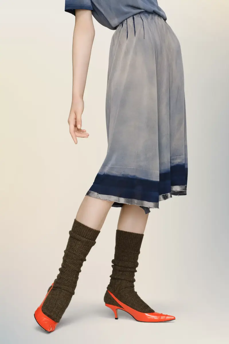 Traendo spunto da veri capi da lavoro, questa gonna è rifinita con un lavaggio vintage che imita la patina dell’esposizione al sole. Una silhouette leggermente arricciata e bordi grezzi richiamano la tecnica Memory of the Hem della Maison, evidenziando tracce di lavorazioni passate. La firma di Maison Margiela, i quattro punti, è visibile sul retro, l’opposto di un’etichetta.