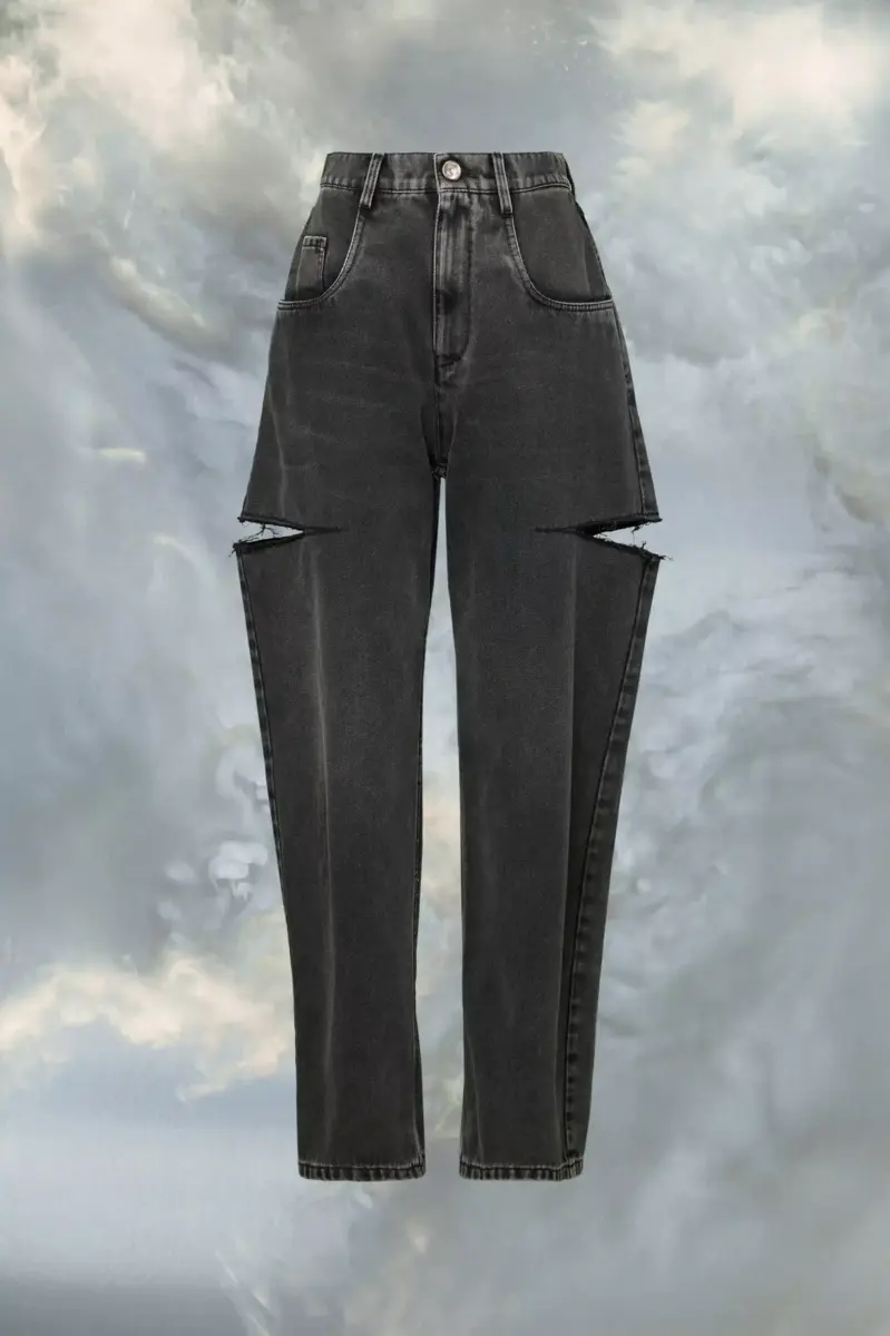 I jeans con lavaggio used presentano spacchi cut-out sulle cosce con bordi grezzi. Sono a cinque tasche e presentano passanti per cintura. Le quattro cuciture distintive di Maison Margiela compaiono sul retro, l’opposto di un’etichetta.