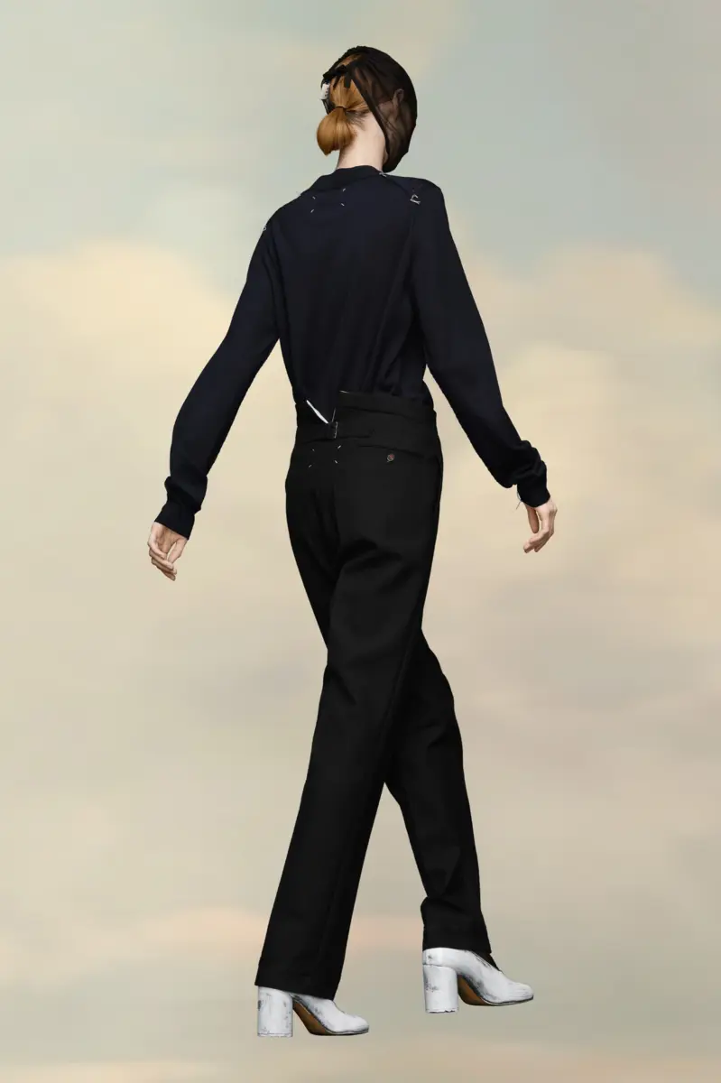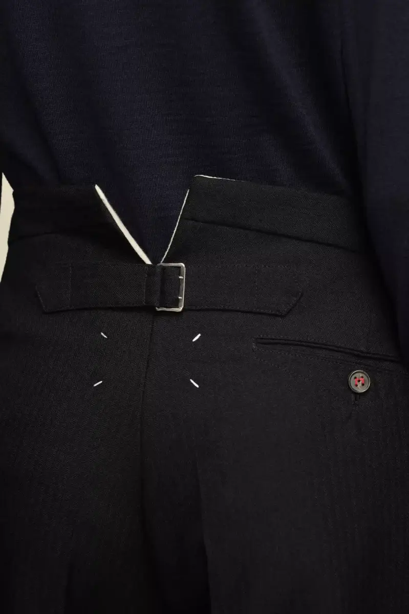 In lana a spina di pesce, questi pantaloni con pinces presentano il gancio e l’occhiello Maison Margiela. Con risvolti, retro regolabile e bottone M, sono rifiniti con quattro cuciture bianche a mostrare la firma della Maison: l’opposto di un’etichetta.