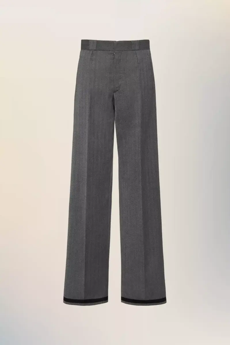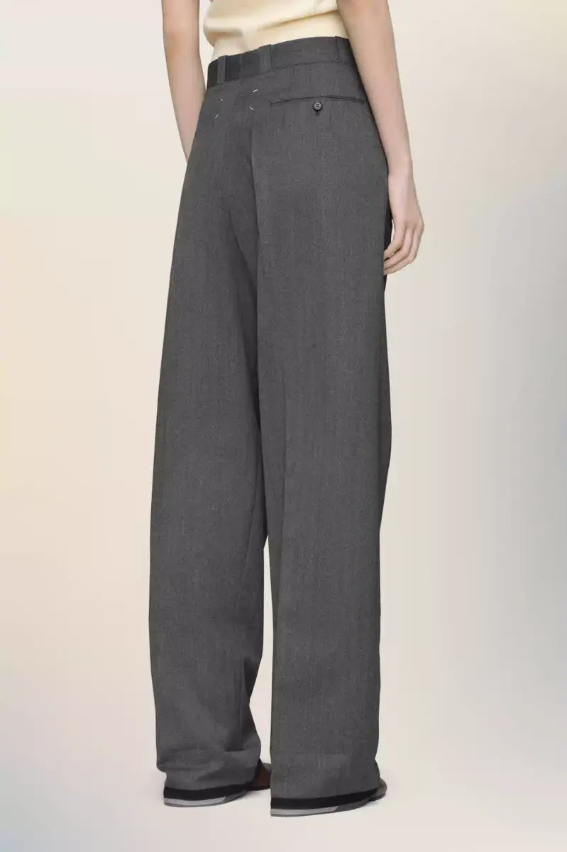 Realizzati in lana a spina di pesce, questi pantaloni combinano un drappeggio strutturato con un volume fluido per reinterpretare i classici tailleur. Una finitura a contrasto sull’orlo rivela la tecnica Memory of the Hem della Maison, che conserva una traccia della costruzione del passato. La firma di Maison Margiela, i quattro punti, appare sul retro; l’opposto di un’etichetta.