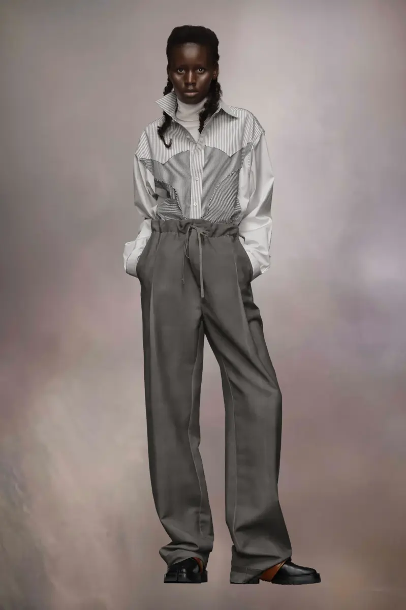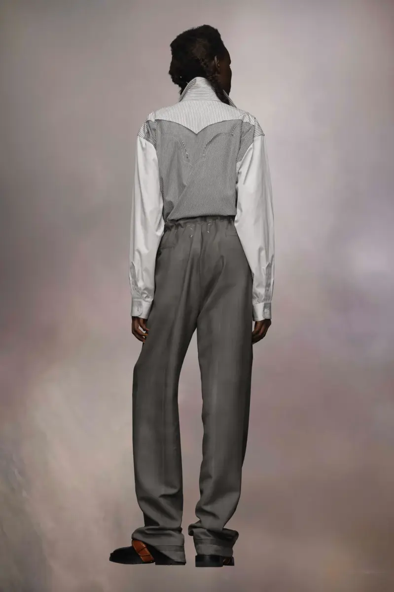 Realizzati in lana mohair, i pantaloni sfoggiano i punti Work-in-progress della Maison in vita. La coulisse casual è in contrasto con le eleganti pieghe. Presentano una tecnica di patinatura grassa applicata a mano per un look vissuto. La firma di Maison Margiela, i Quattro punti, è visibile sul retro; l’opposto di un’etichetta.