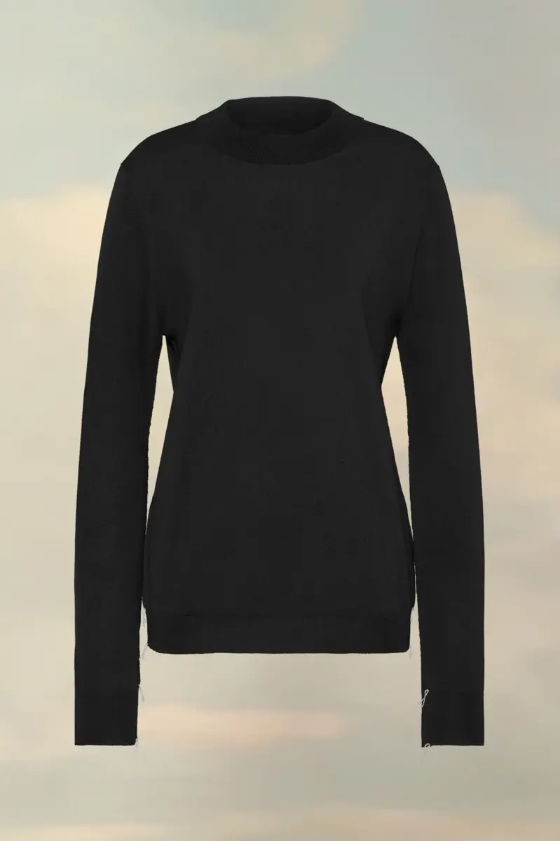 Con i punti Work-in-progress della Maison sulle spalle e fili sciolti per un’estetica non finita, il classico maglione girocollo è realizzato in pregiata lana Merino. La firma di Maison Margiela, i Quattro punti, è visibile sul retro, l’opposto di un’etichetta. Finezza 18.