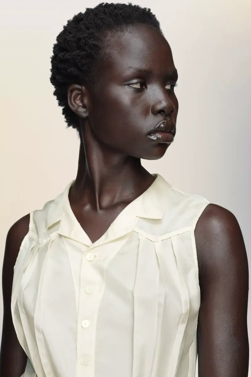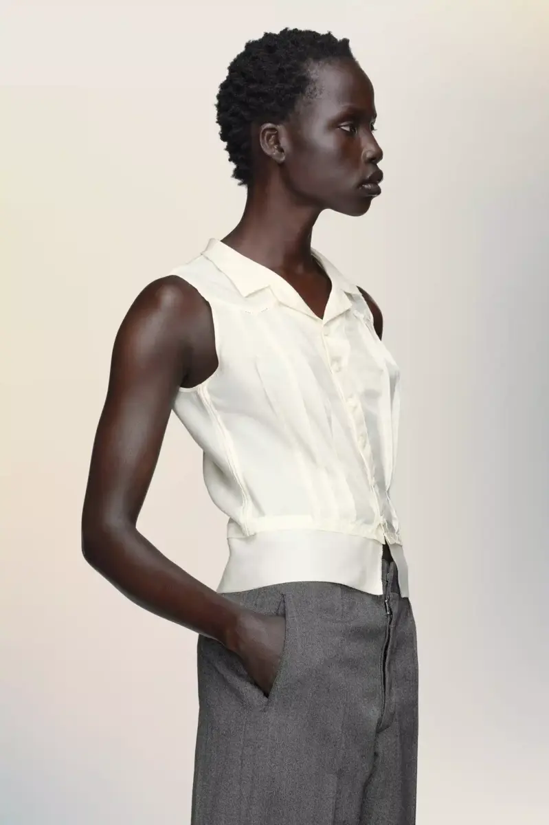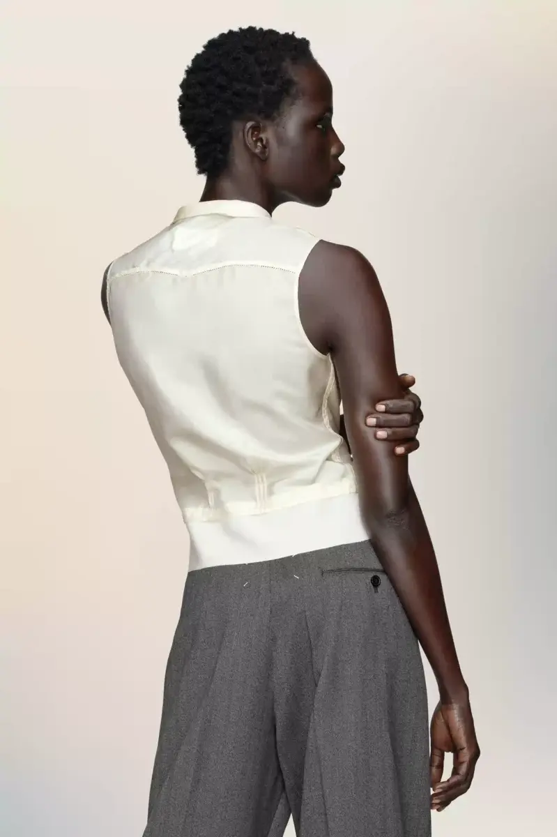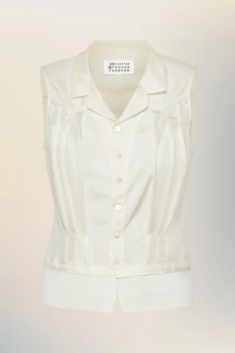 La sartorialità in seta è destrutturata in questa blusa senza maniche, definita da pieghe scultoree, cuciture interne a vista e un orlo a contrasto che richiama la camicia. Il colletto piatto e la chiusura frontale con bottoni introducono dettagli classici, mentre la silhouette bilancia morbidezza e struttura per una rivisitazione moderna di forme tradizionali. La firma di Maison Margiela, le quattro cuciture, è visibile sul retro, l’opposto di un’etichetta.