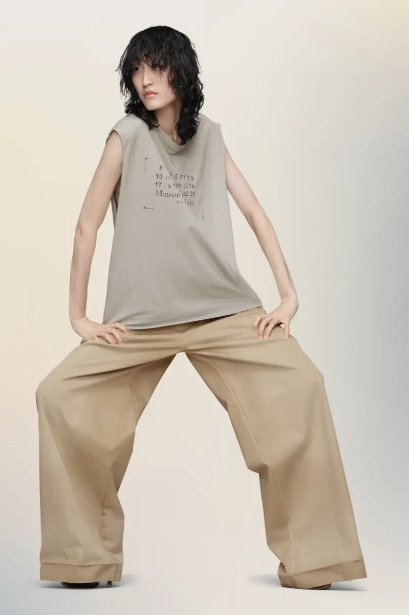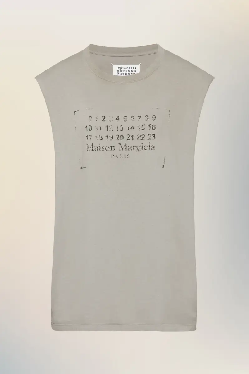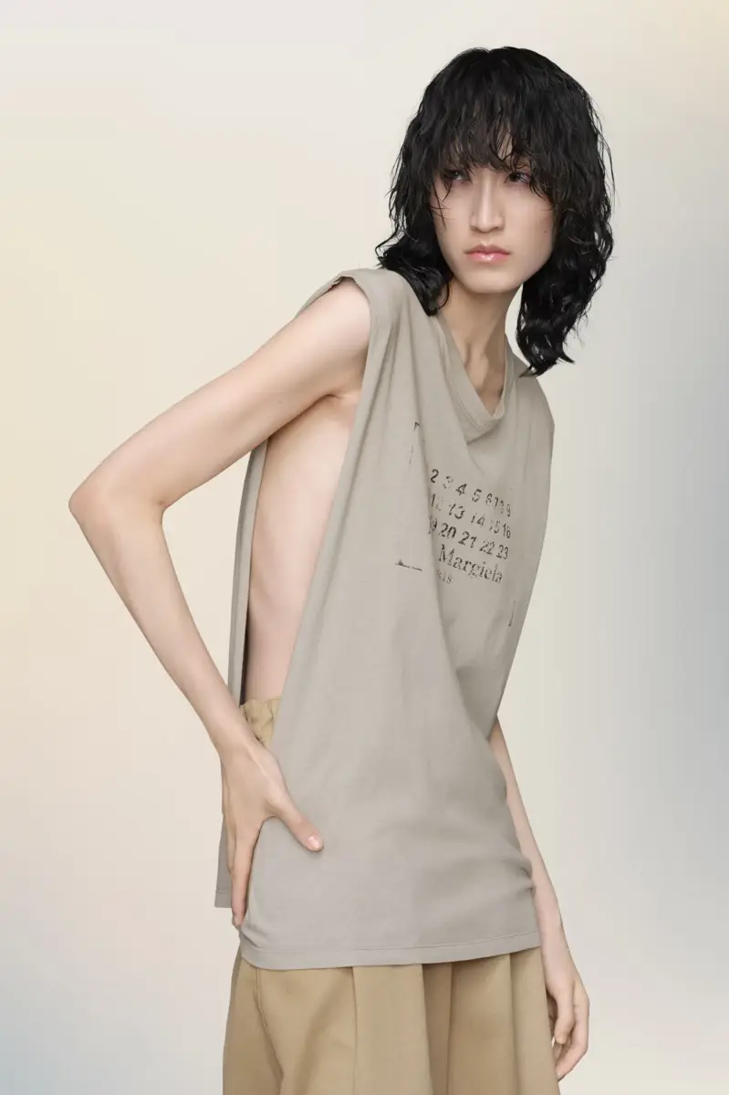 Minimalista nella costruzione e nel taglio per facilitare la sovrapposizione, questo top senza maniche è rifinito con bordi grezzi e una versione sbiadita del logo numerico della Maison. La firma di Maison Margiela, i quattro punti, appare sul retro; l’opposto di un’etichetta.
